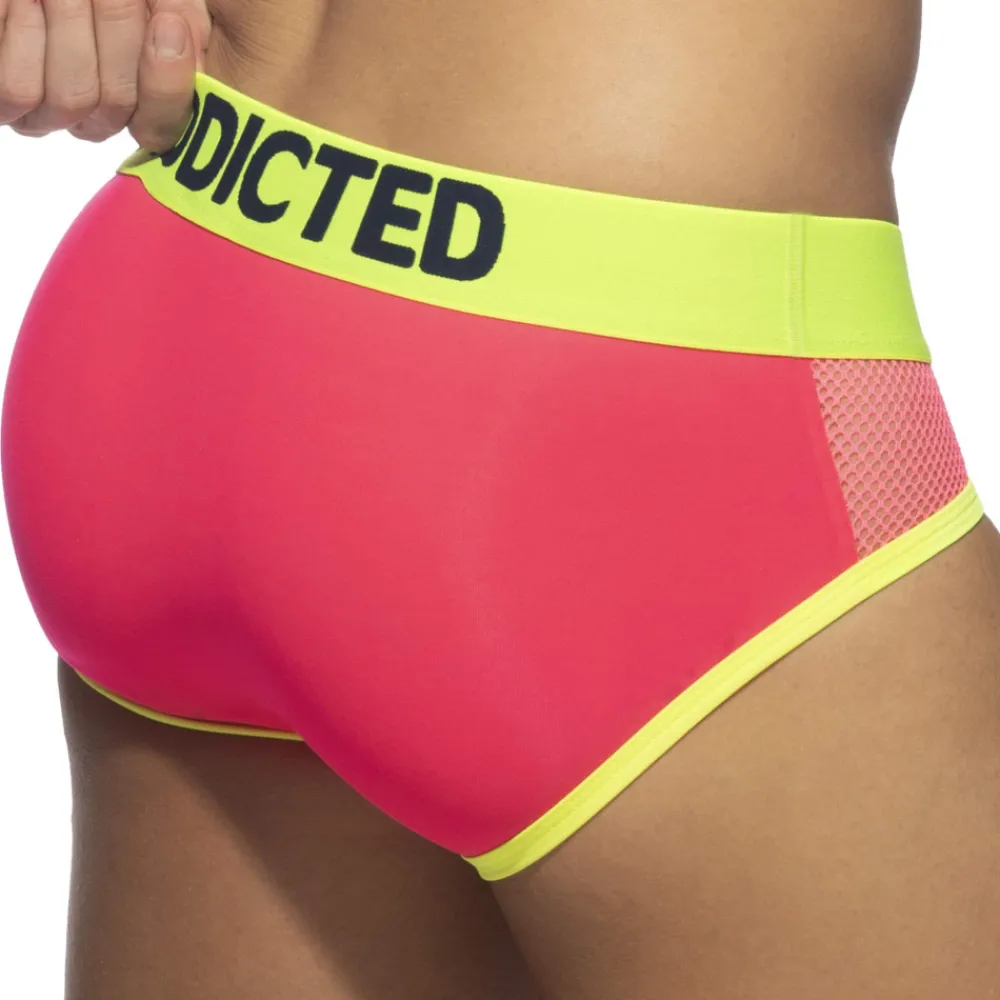 Slip taille basse en microfibre stretch de couleur intense. Panneaux latéraux en mesh ajouré. Poche frontale de grande capacité. Bordures de couleur contrastée. Ceinture élastique signée Addicted.