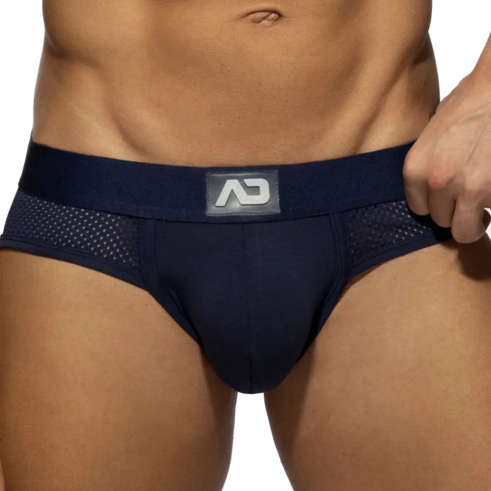 Slip taille basse en coton doux et respirant de couleur unie. Panneaux latéraux en mesh ajouré. Poche frontale de grande capacité. Ceinture élastique avec logo AD en silicone. Edition imitée.