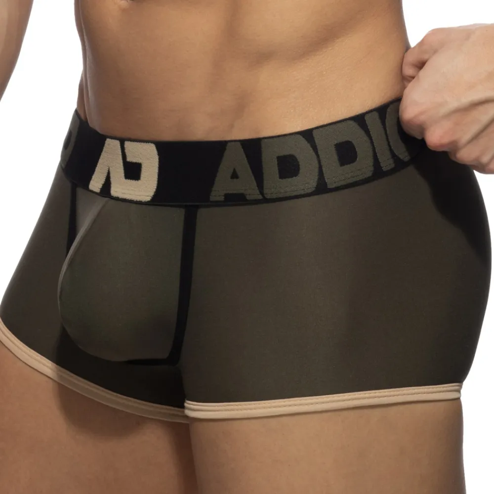 Boxer court en mélange doux et souple de microfibre et de coton. Coupe taille basse et ajustée. Grande poche frontale push up pour un excellent maintien et une valorisation naturelle de votre masculinité. Bordures de couleur contrastée. Large ceinture élastique signée Addicted.