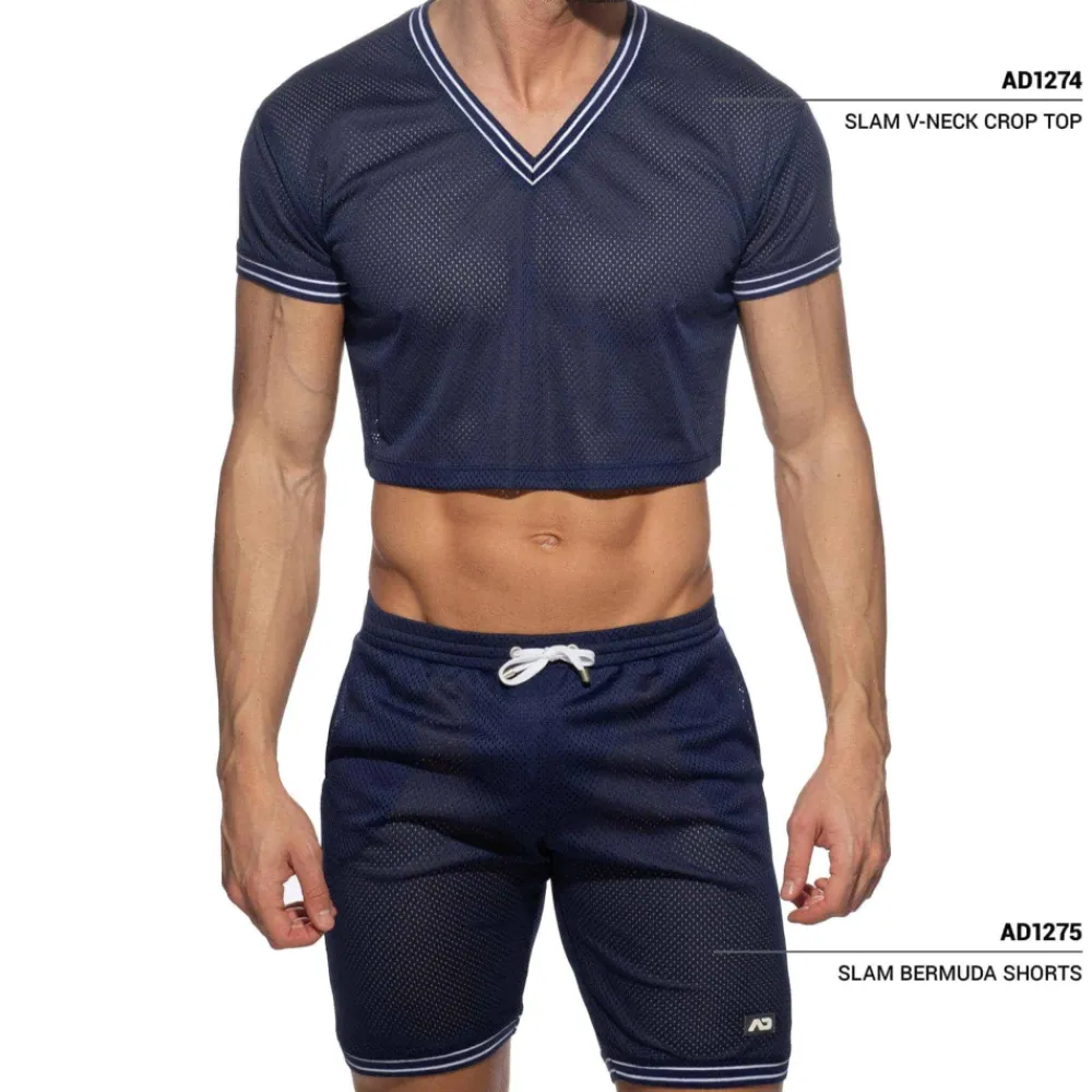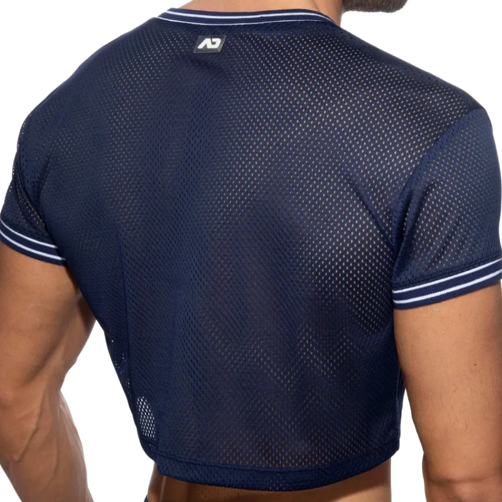 T-shirt en mesh sport, léger et respirant, inspiré du basketball. Coupe raccourcie pour dévoiler vos abdos. Manches courtes et col en V soulignés par une double bande sport. Etiquette AD en silicone dans le dos.