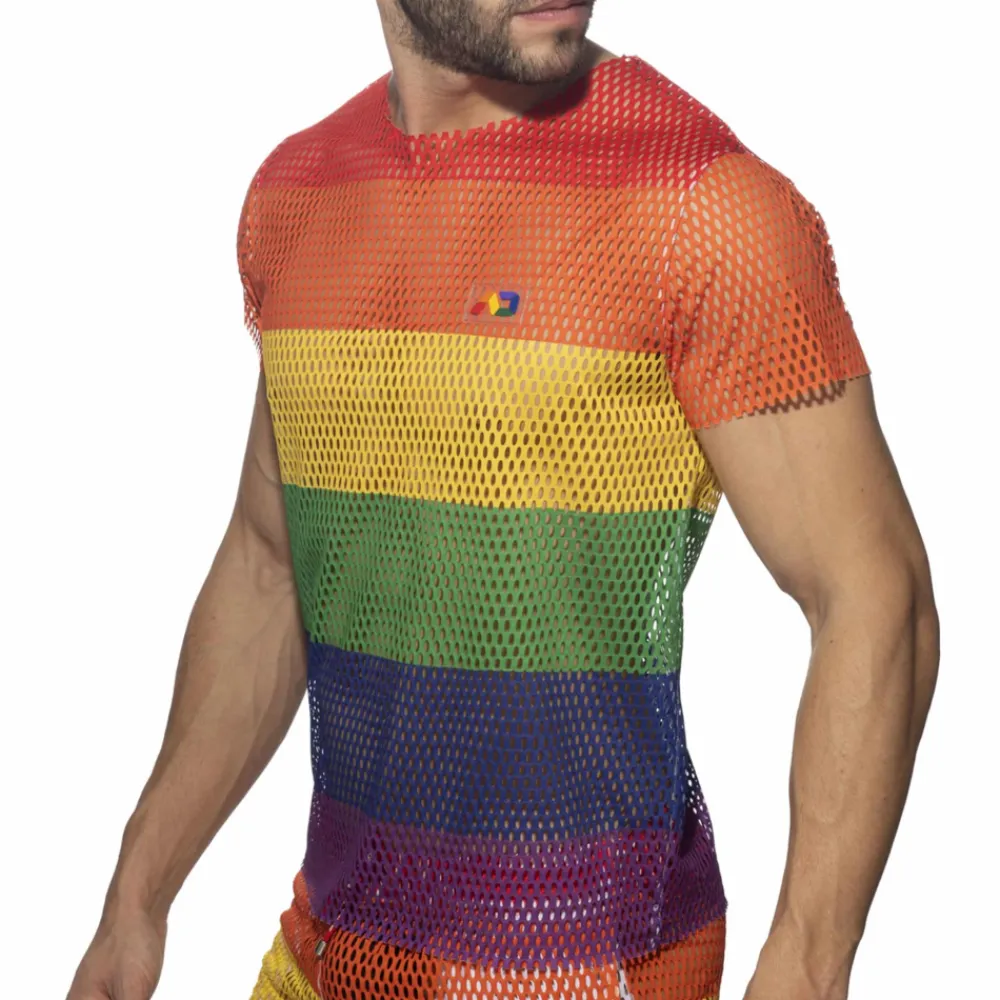 T-shirt très sexy en mesh sport, dont le maillage large laisse peu de place à l’imagination. Imprimé rayé aux couleurs de l’arc-en-ciel. Coupe oversize. Logo AD en silicone sur la poitrine gauche.