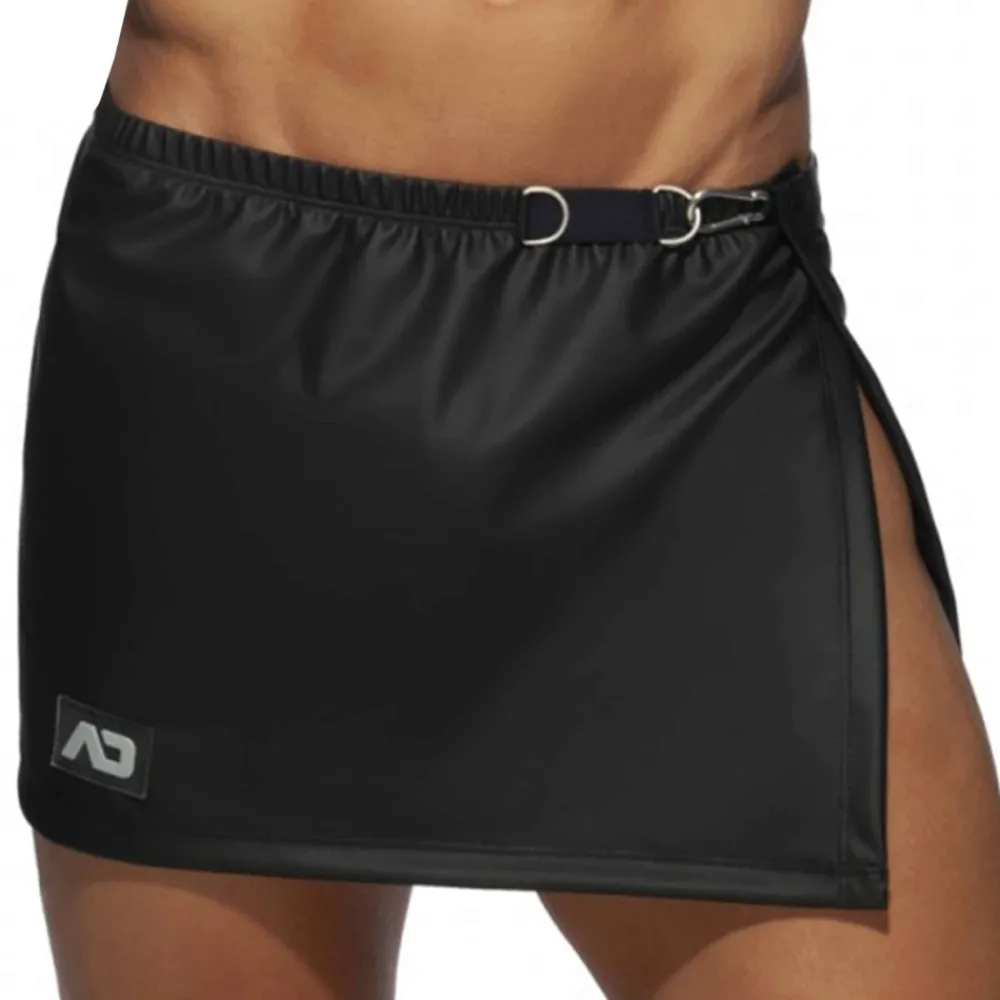 Jupe courte fendue en microfibre mate imitant le cuir. Ceinture élastique et mousqueton métallique pour un ajustement parfait. Logo AD en silicone.