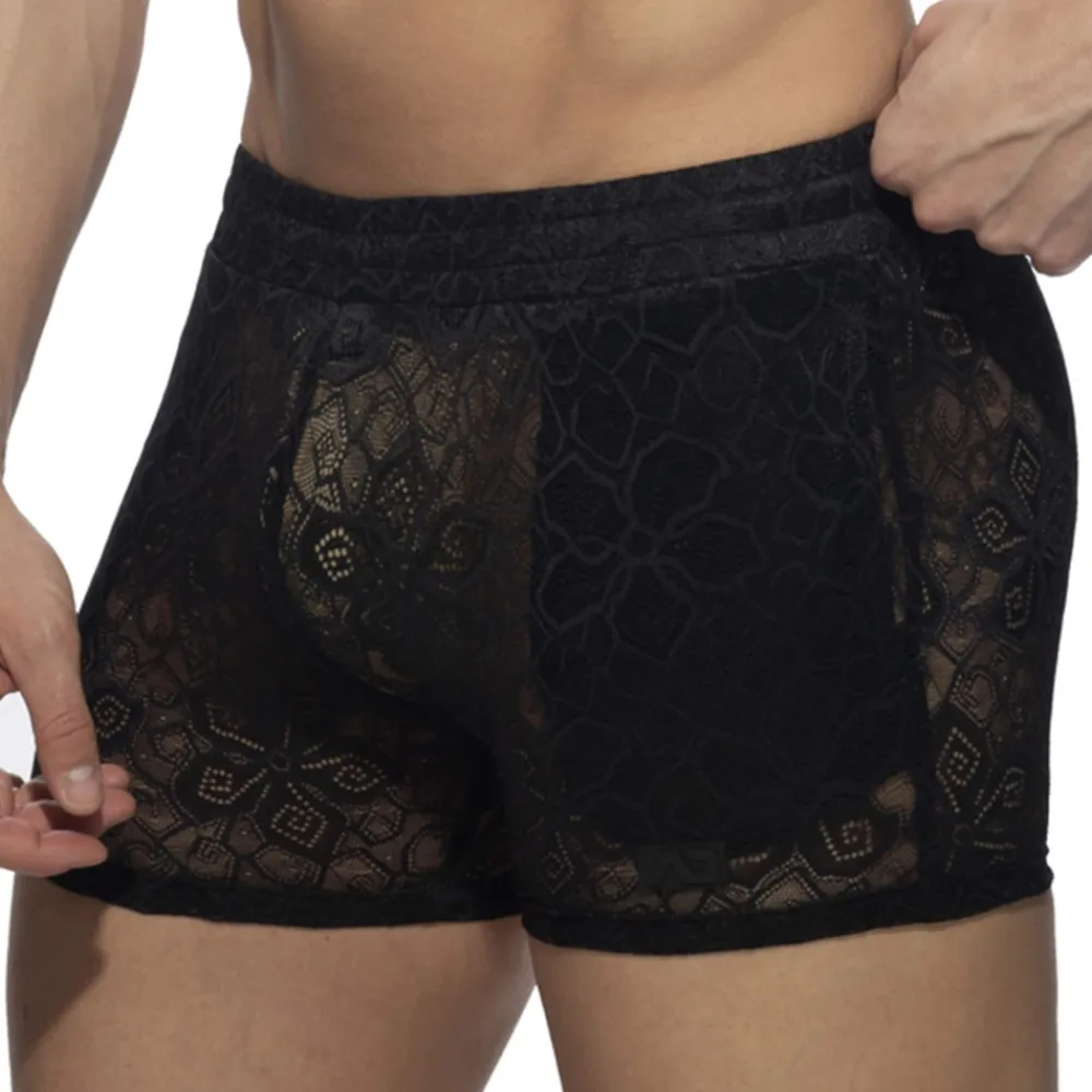 Short très luxueux en dentelle transparente décorée d’un motif floral. Deux poches latérales. Ceinture élastique recouverte avec cordon de serrage intérieur. Logo AD en silicone sur la jambe gauche.