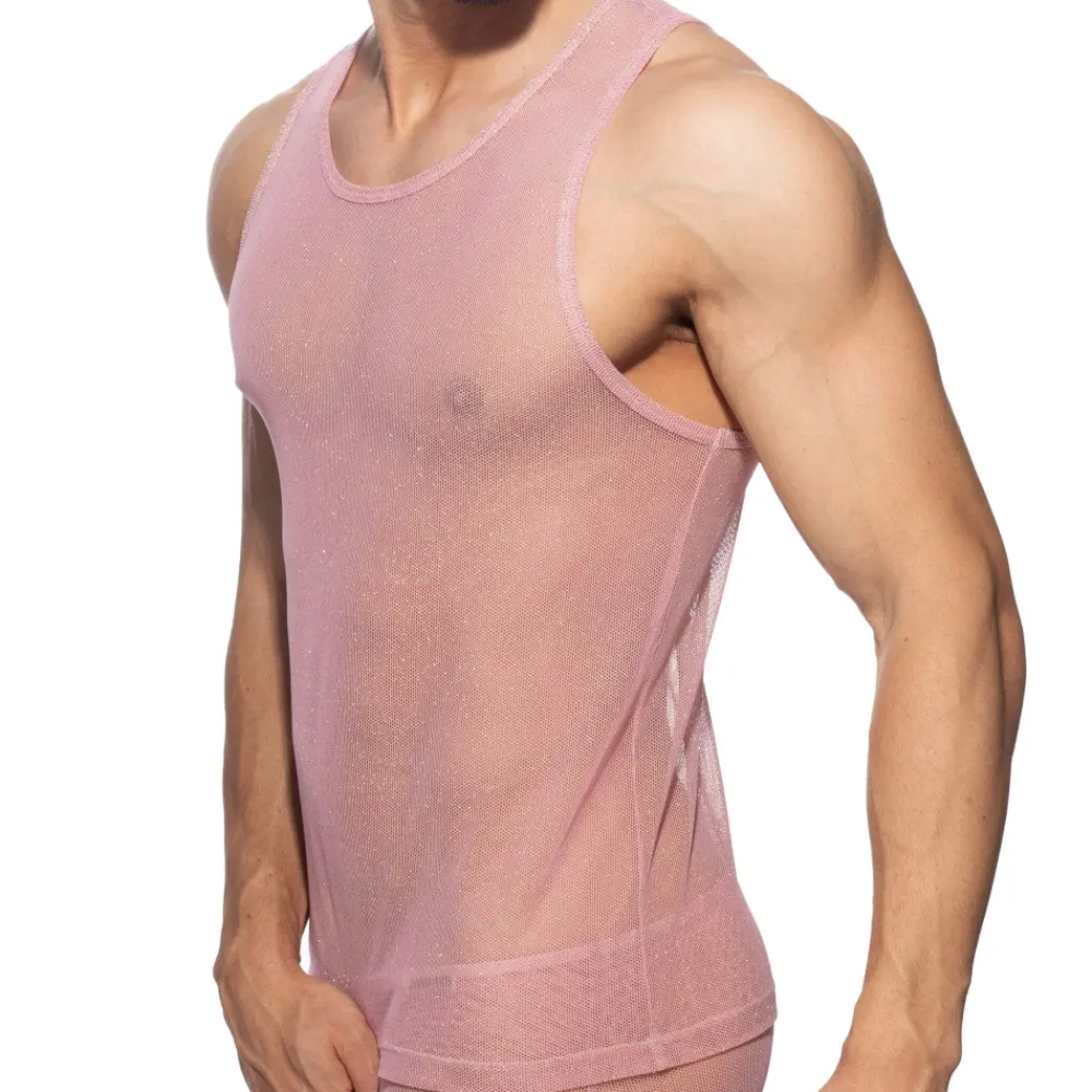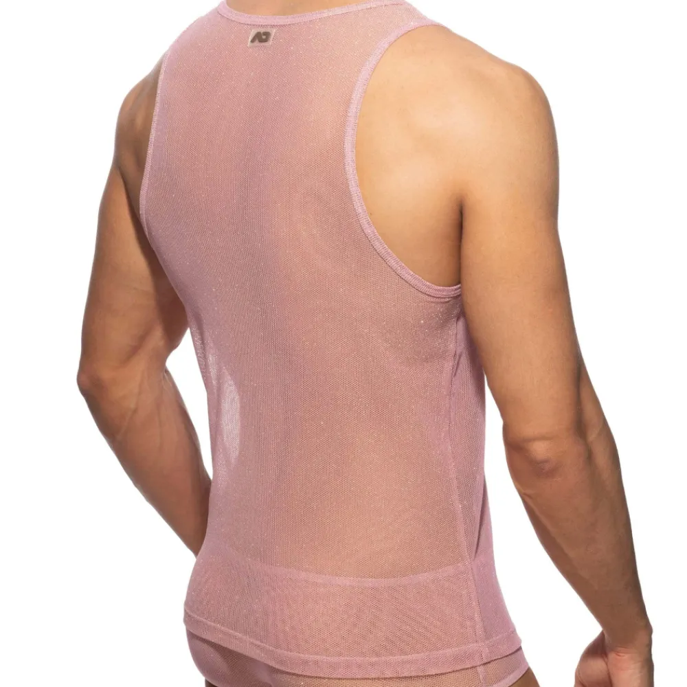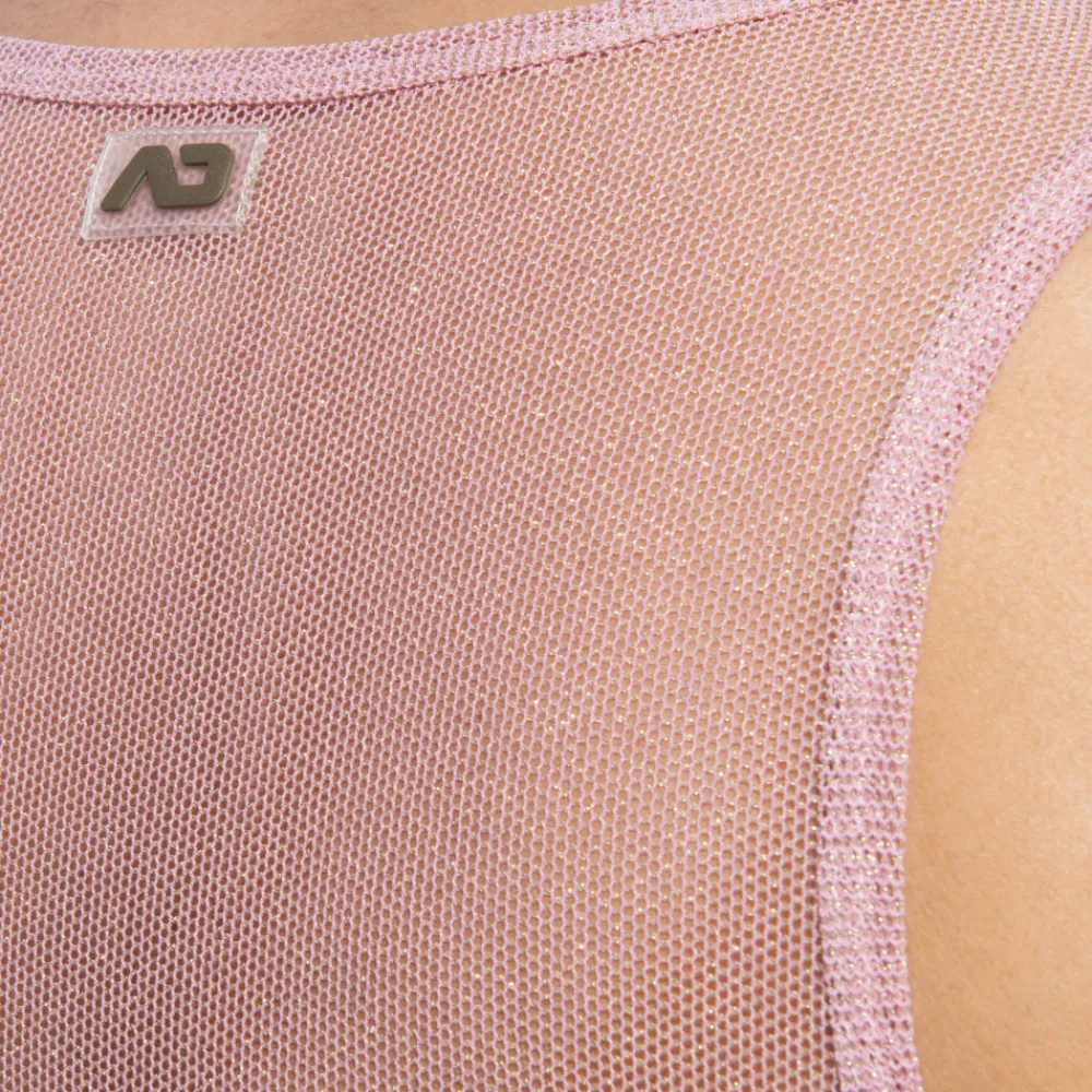 Débardeur sophistiqué et sexy en résille transparente ornée de fils métallisés dorés. Matière fine, légère et respirante. Coupe ajustée. Col rond. Logo Addicted en silicone dans le dos.