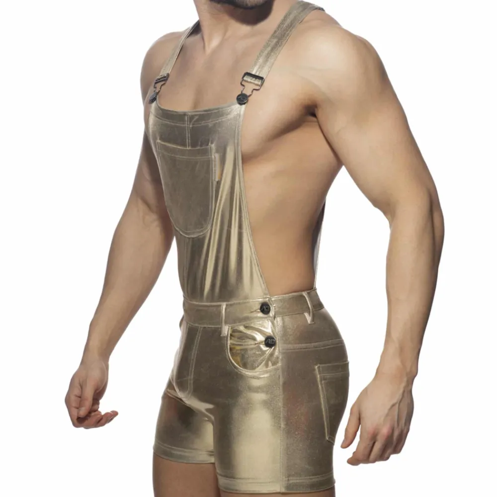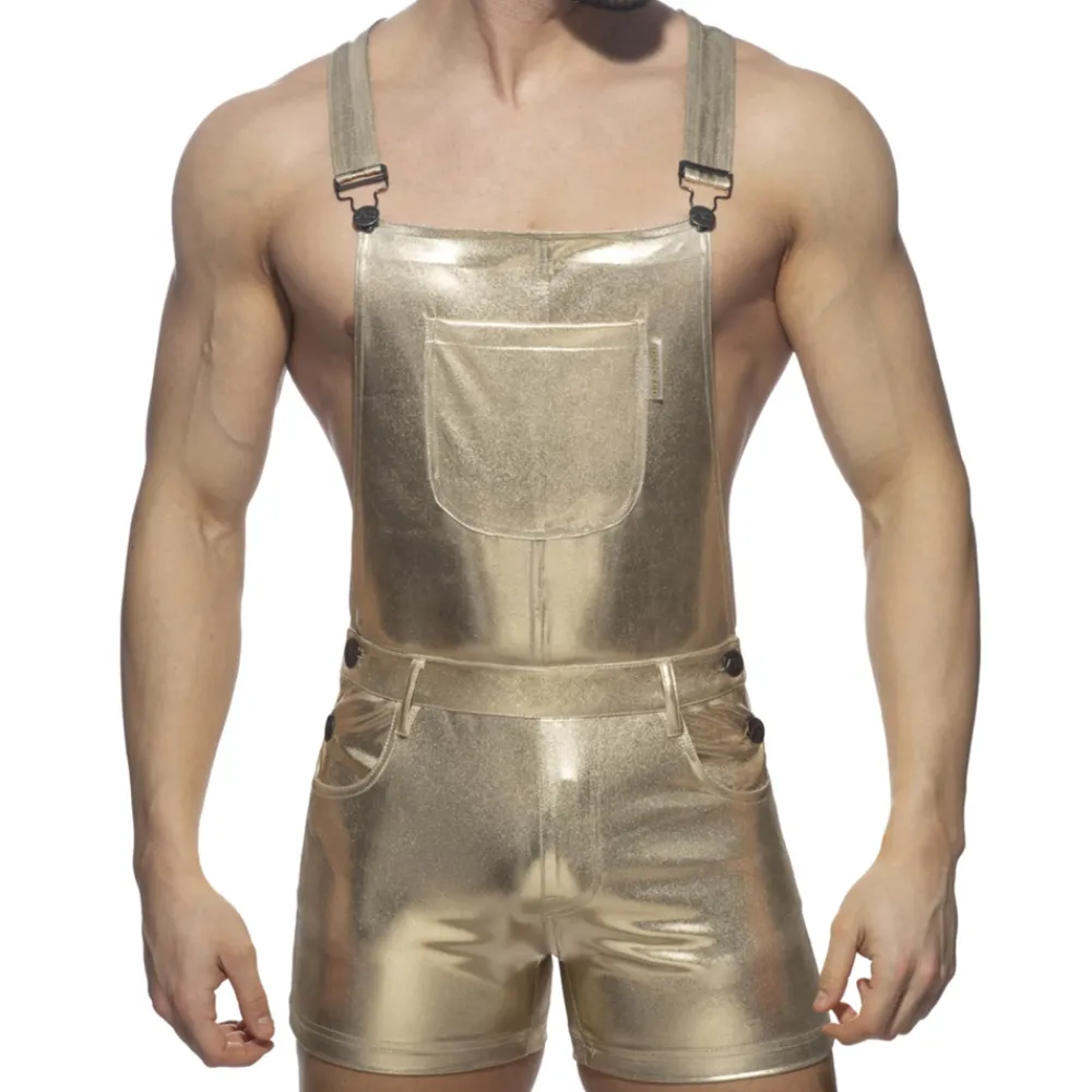 Salopette sexy en microfibre stretch métallisée brillante. Bretelles réglables. 1 poche sur la poitrine, 2 poches latérales et 2 poches arrières. Fermeture à double bouton de chaque côté. Braguette factice. 5 passants de ceinture. Logo AD en silicone en haut du dos.