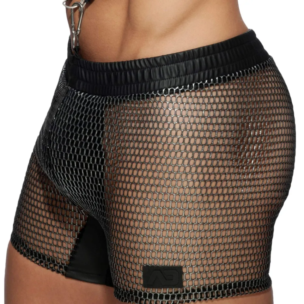 Short fétichiste en mesh métallisé imitant la cotte de mailles. Entrejambe en simili cuir. Poche intérieure Kango pour un grand confort frontal. Anneau métallique pour attacher un harnais (vendu séparément) à la ceinture élastique. Logo Addicted en silicone sur la cuisse gauche.
