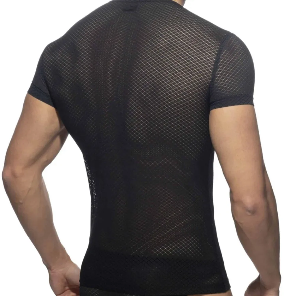 T-shirt sexy en matière semi-transparente décoré d’un motif géométrique. Coupe très ajustée. Logo Addicted en silicone en haut du dos.