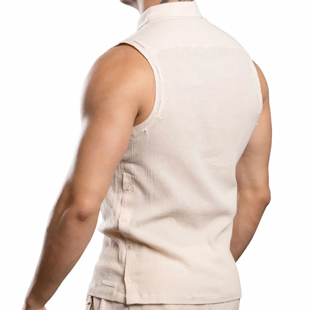 Chemise légère sans manches en crêpe de coton doux et respirant. Coupe originale avec ses ouvertures latérales fermées par 3 boutons. Fermeture devant par 7 boutons. Cordons ajustables au niveau des emmanchures. Logo Andrew Christian sur la hanche gauche. Édition limitée.
