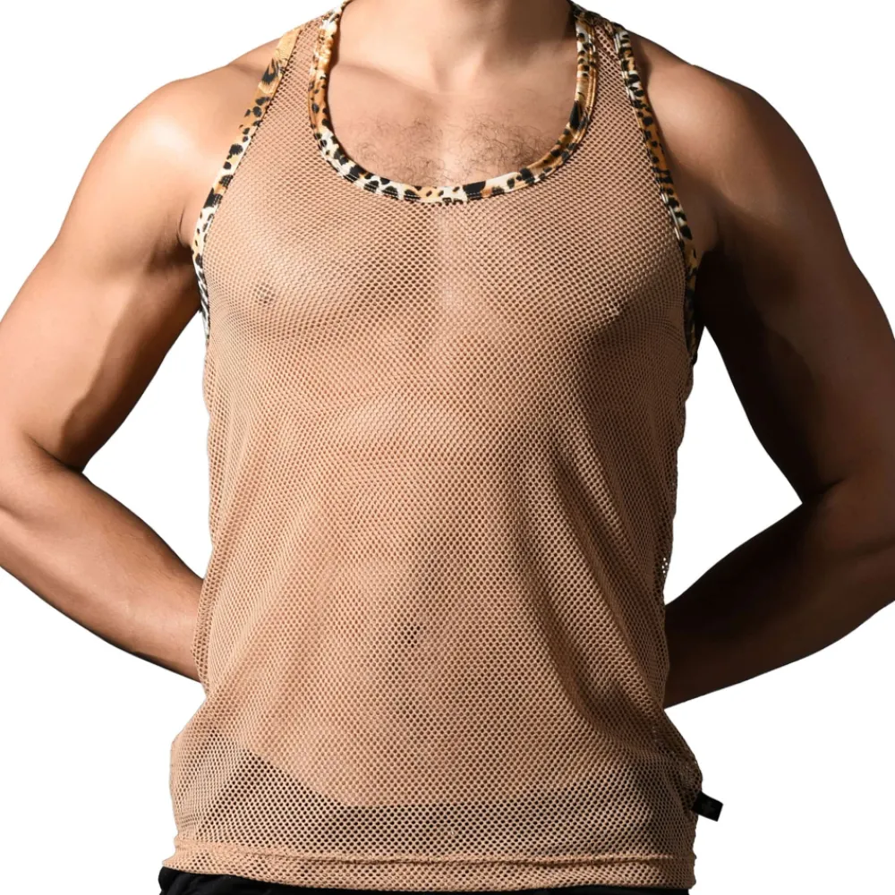 Débardeur en maille ajourée et transparente. Tissu très doux, extensible dans 4 directions. Détails de couleur léopard. Edition limitée