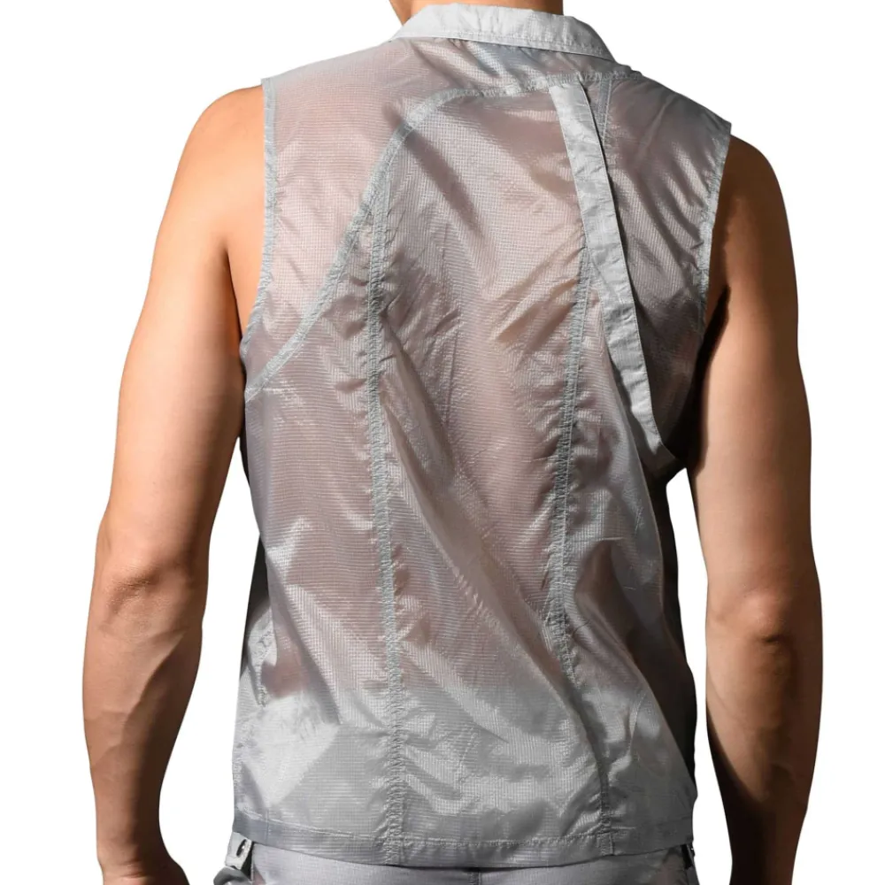 Veste sans manche en tissu translucide, léger et confortable. Coupe très ajustée avec sangle réglable, façon harnais, sur le côté droit. Col chemise. Fermeture par 5 boutons-pression. Edition limitée.