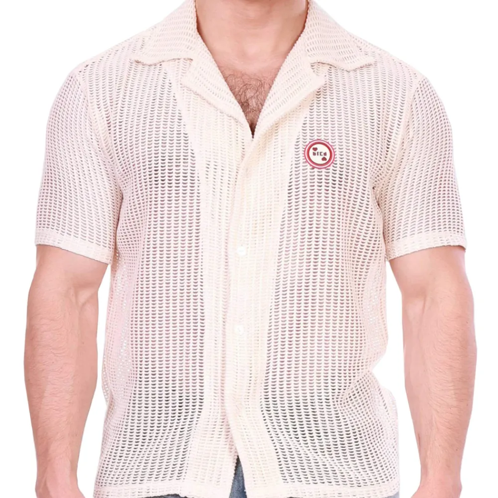 Chemise en crochet semi-transparent. Tissu tricoté, confortable et doux. Manches courtes. Fermeture 4 boutons. Logo Barcode en silicone.