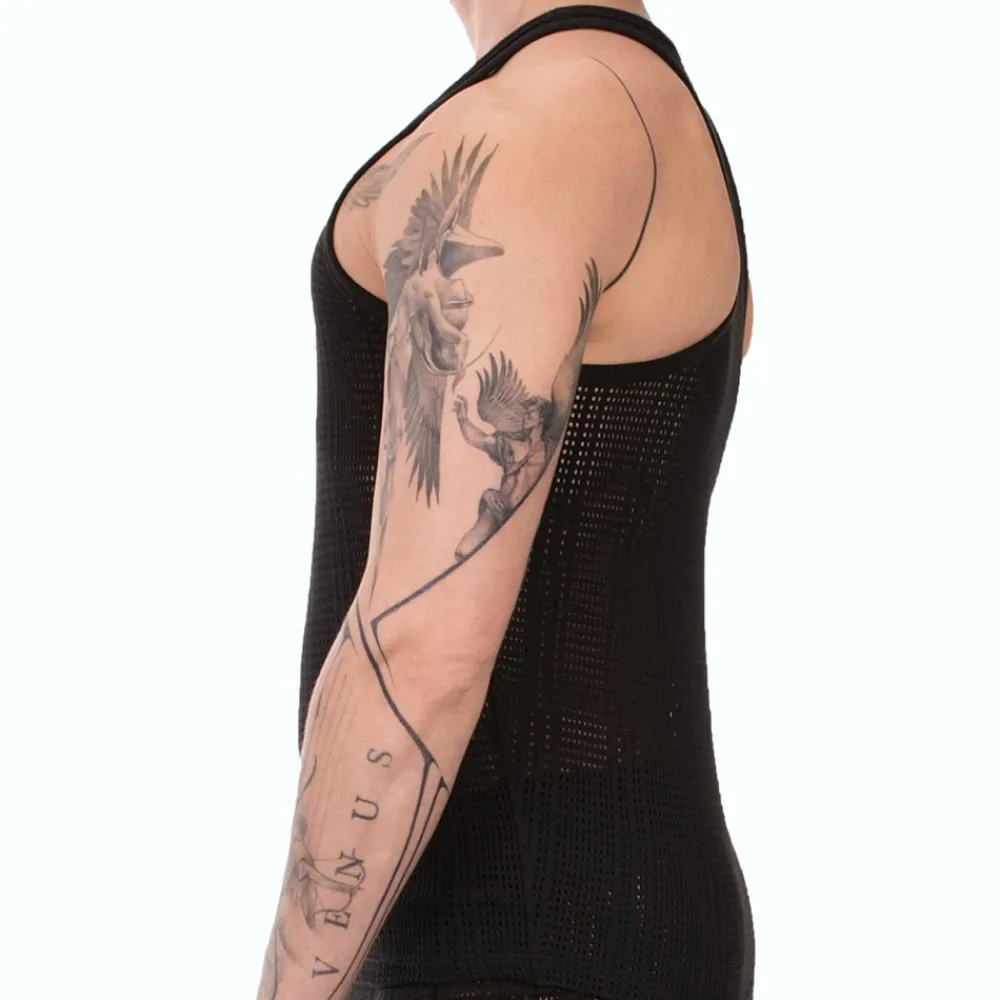 Débardeur en crochet semi-transparent. Tissu tricoté, confortable et doux. Col rond. Logo Barcode en silicone au dos.