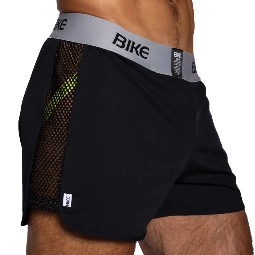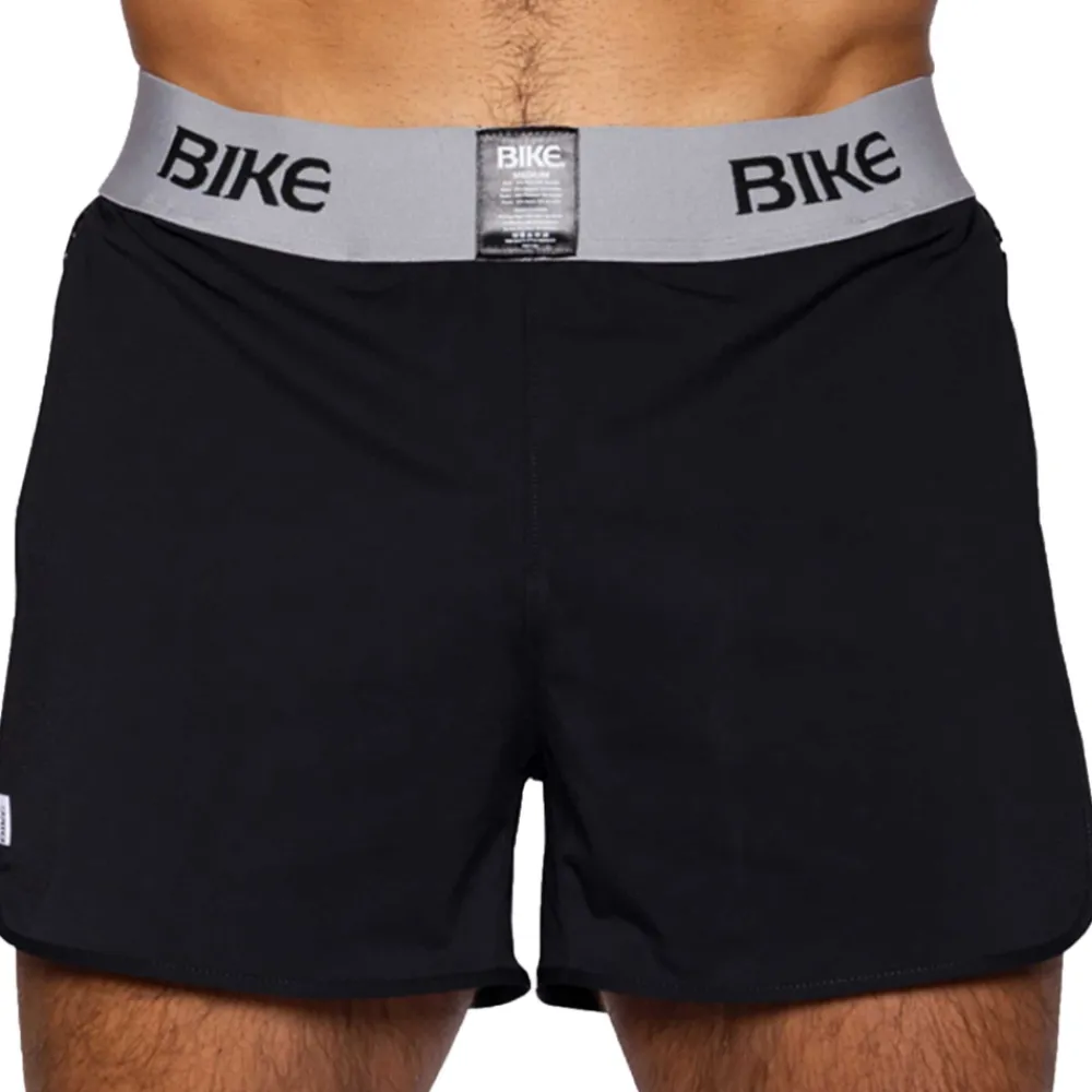 Short sport intégrant un jockstrap pour un confort et un maintien incomparables. En microfibre extensible, douce et légère. Bandes transparentes en résille sur les côtés. Poche avec fermeture éclair à l’arrière. Large ceinture élastique de couleur contrastée signée BIKE.