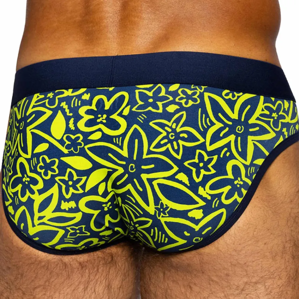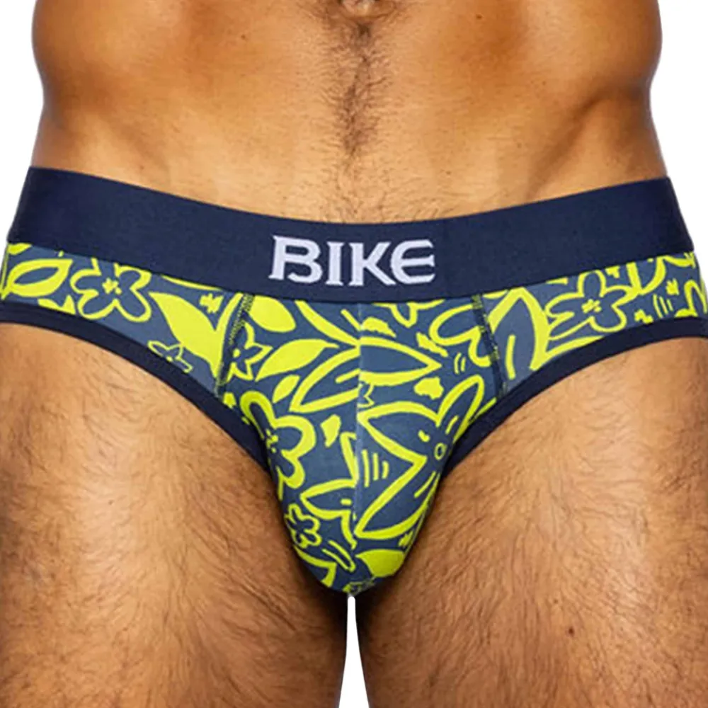 Slip en coton extensible, doux et confortable. Imprimé floral très tendance. Coupe taille basse et ajustée. Poche frontale assurant un maintien ferme et confortable. Ceinture élastique signée BIKE.