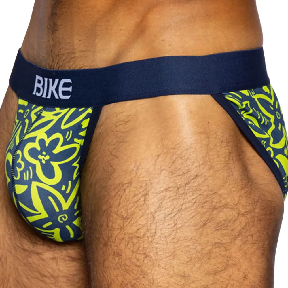 Slip en coton extensible, doux et confortable. Imprimé floral très tendance. Coupe tanga, taille basse et ajustée. Poche frontale assurant un maintien ferme et confortable. Ceinture élastique signée BIKE.