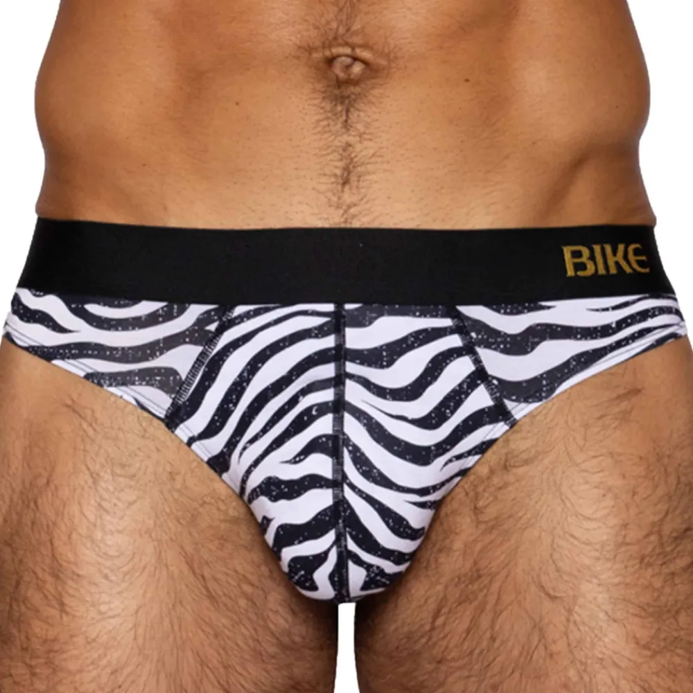 String sport et sexy en modal extensible super doux et confortable. Imprimé zèbre. Coupe taille basse très ajustée. Poche frontale doublée. Ceinture élastique signée BIKE en lettres dorées.