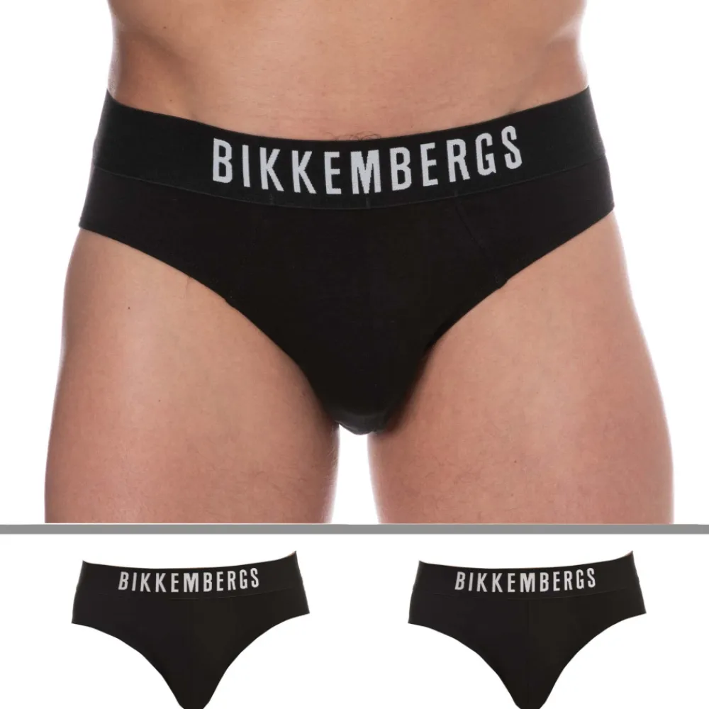 Lot de deux slips en coton extensible, très doux et confortable. Poche frontale doublée. Ceinture élastique signée Bikkembergs.