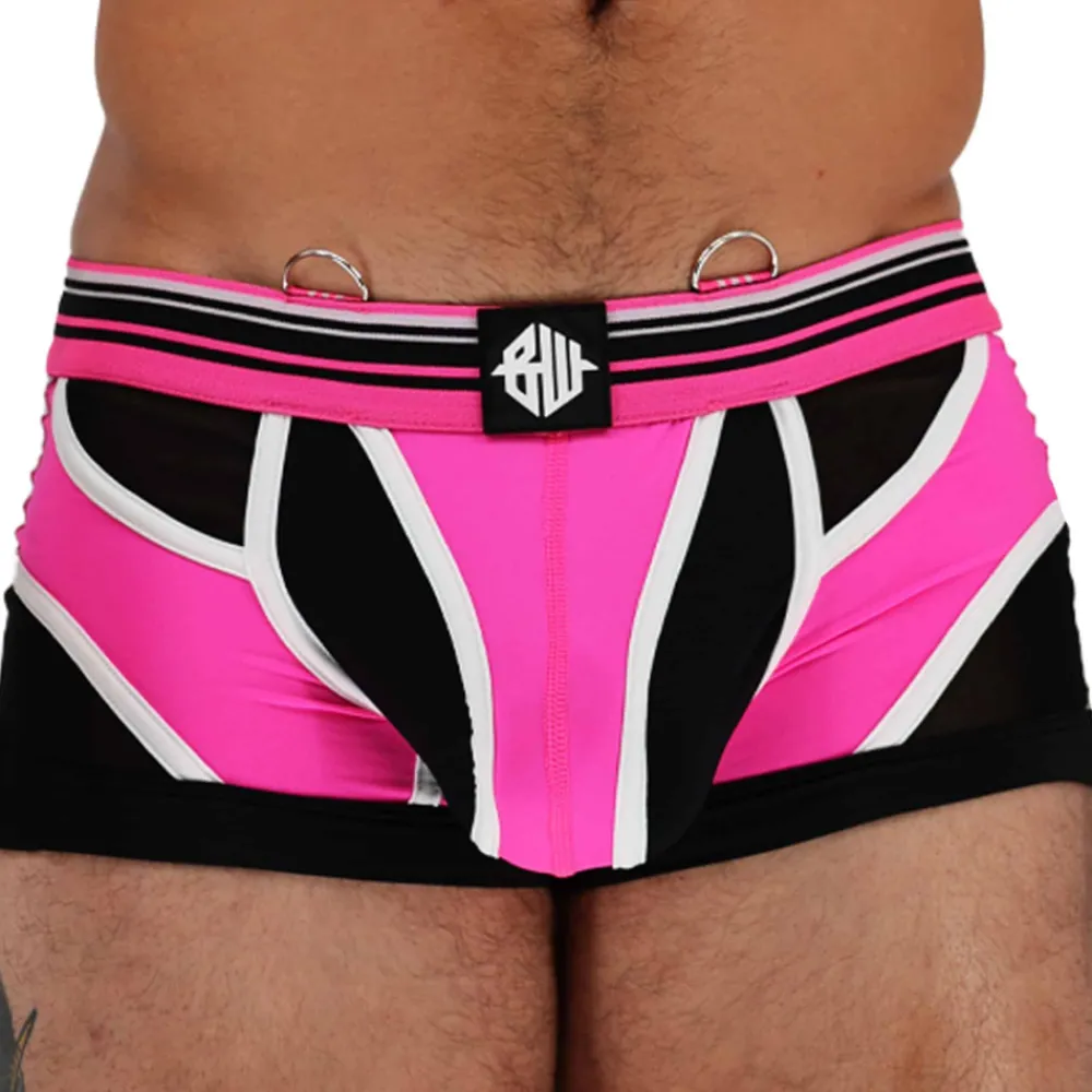 Boxer original et audacieux en microfibre ultra douce et confortable. Empiècements transparents en résille fine. Bandes de couleur contrastée pour un style graphique. Poche frontale non doublée. Ceinture élastique rayée dotée de 2 anneaux métalliques pour attacher le harnais Circuit Breaker (vendu séparément). Patch Breedwell devant et logo en silicone derrière.