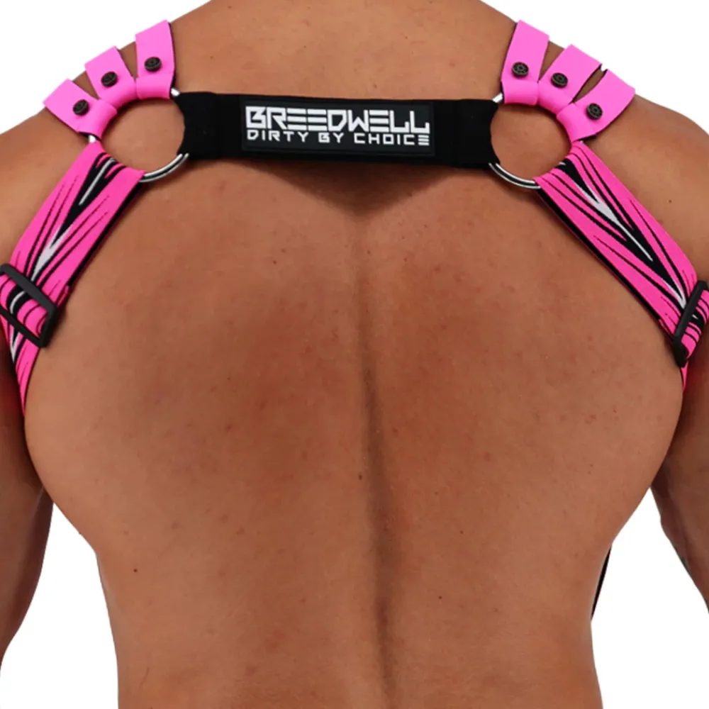 Harnais sexy composé de bandes élastiques ajustables. Triples bretelles sur les épaules. Patchs Breedwell en PVC de qualité supérieure. 7 anneaux métalliques. Bande horizontale amovible sur la poitrine. Peut être attaché au jock, chock ou boxer Circuit Breaker (vendus séparément) grâce à 2 mousquetons.