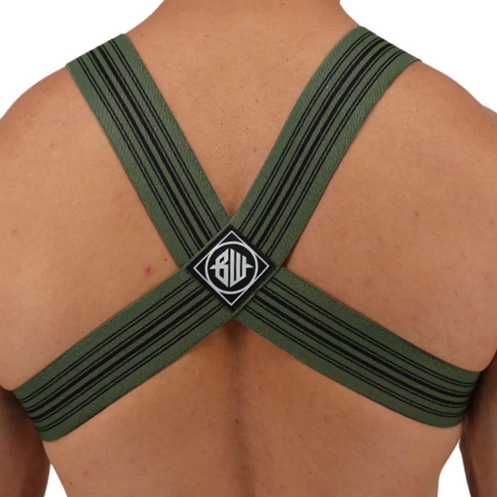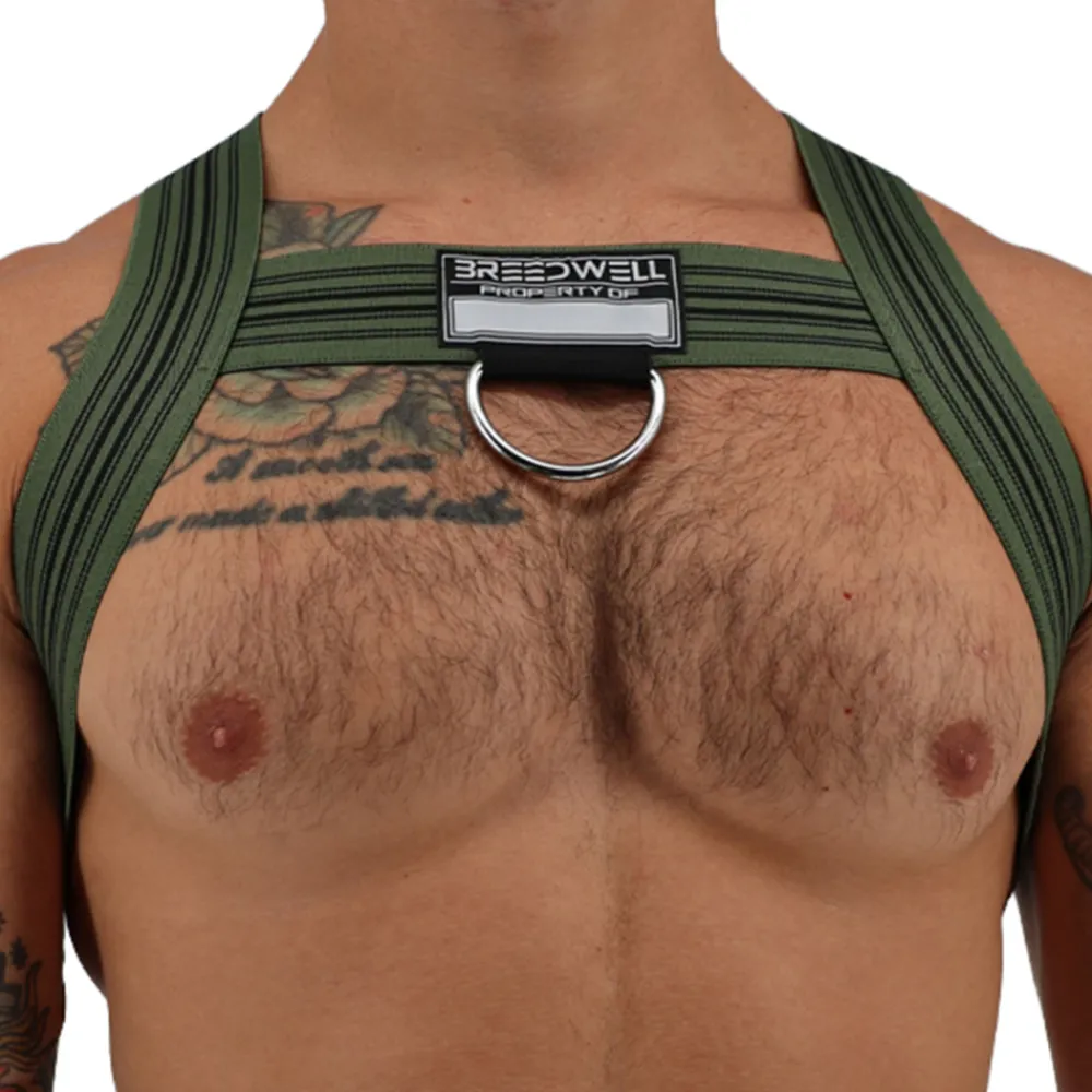 Harnais sexy constitué de bandes élastiques larges formant un X dans le dos. Devant, la forme en H met en valeur vos pectoraux. Patch Breedwell à l’avant avec anneau métallique.