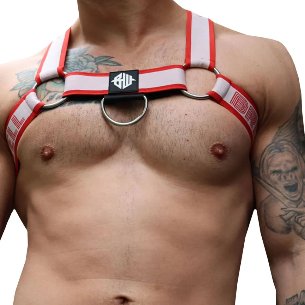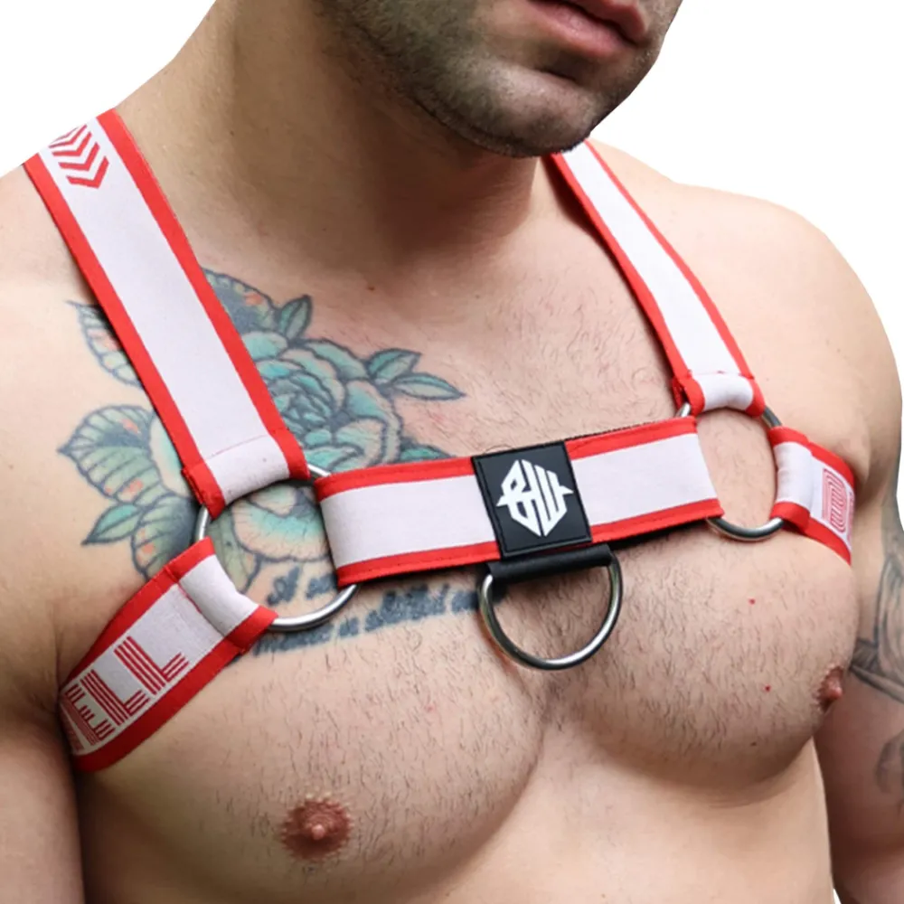 Harnais ultra sexy constitué de bandes élastiques bicolores signées Breedwell. Bretelles réglables reliées par des anneaux en acier inoxydable. Sangle horizontale amovible sur la poitrine avec patch Breedwell en PVC.
