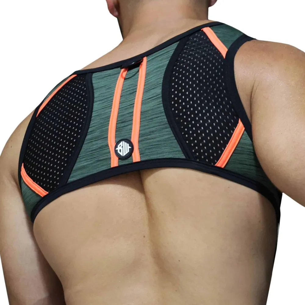 Harnais sexy en microfibre chinée. Peut être attaché au boxer jock chock ou au jock strap Cockpit (vendus séparément) grâce à 2 mousquetons. Détachez les sangles latérales et sous la poitrine et le harnais devient un crop top. Empiècements en mesh. Patchs Breedwell en PVC de qualité supérieure. Anneaux métalliques.