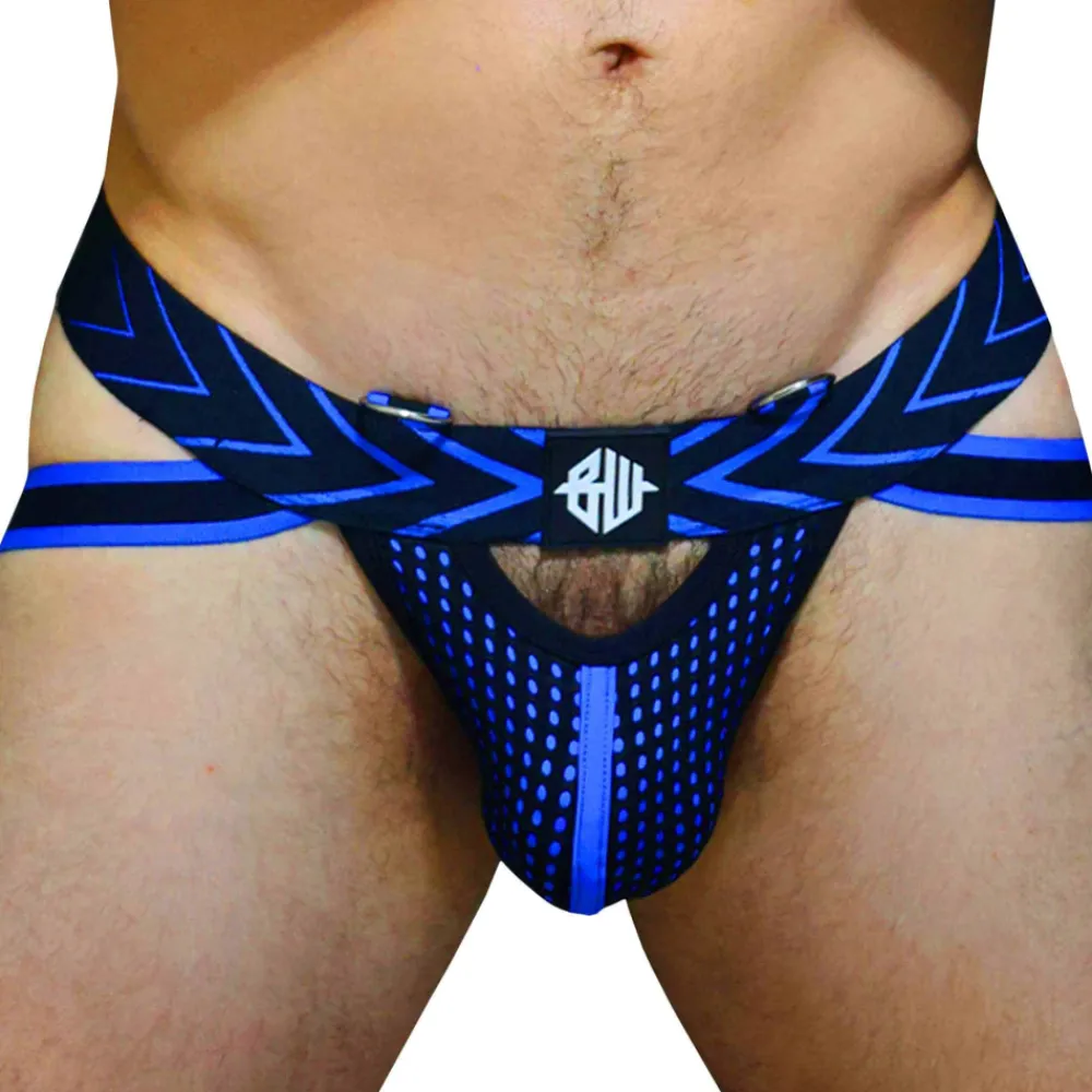 Jockstrap fetish en microfibre ultra douce, fine et légère. Bande contrastée soulignant le volume de la poche frontale doublée de mesh. Ceinture élastique à chevrons dote de 2 anneaux métalliques. Patch Breedwell.