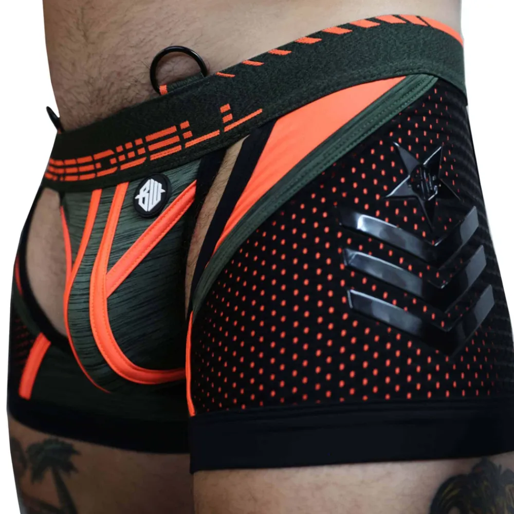 Sous-vêtement au design original et provocant combinant un jockstrap et un boxer. Conçu en microfibre chinée ultra douce, fine et légère. Poches latérales en mesh. Motif d’inspiration militaire en silicone sur la cuisse gauche. Bandes contrastées soulignant le volume de la poche frontale. Ceinture élastique dotées de 2 anneaux métalliques devant et 4 anneaux métalliques derrière. Patch Breedwell.