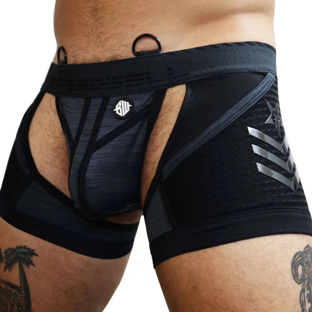 Sous-vêtement au design original et provocant combinant un jockstrap et un boxer. Conçu en microfibre chinée ultra douce, fine et légère. Poches latérales en mesh. Motif d’inspiration militaire en silicone sur la cuisse gauche. Bandes contrastées soulignant le volume de la poche frontale. Ceinture élastique dotées de 2 anneaux métalliques devant et 4 anneaux métalliques derrière. Patch Breedwell.