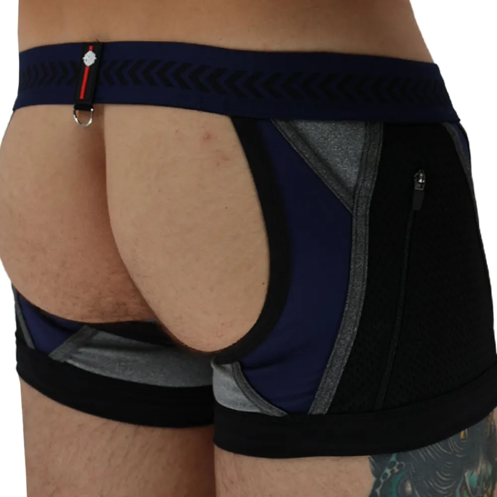 Sous-vêtement au design original et provocant combinant un jockstrap et un boxer. Conçu en jersey épais et doux de qualité supérieure. Bandes contrastées et empiècements latéraux en résille soulignent le volume de la poche frontale. Poches latérales zippées en mesh. Ceinture élastique décorée d’un motif à chevrons. Anneaux métalliques pour attacher un harnais body (vendu séparément). Patchs Breedwell en PVC.