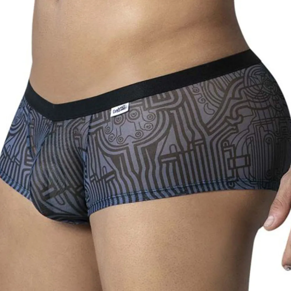Mini boxer très sexy en résille transparente imprimée d’un motif inspiré de l’Egypte antique. Coupe minimaliste, taille basse et ajustée. Poche frontale préformée, non doublée. Ceinture élastique contrastée.