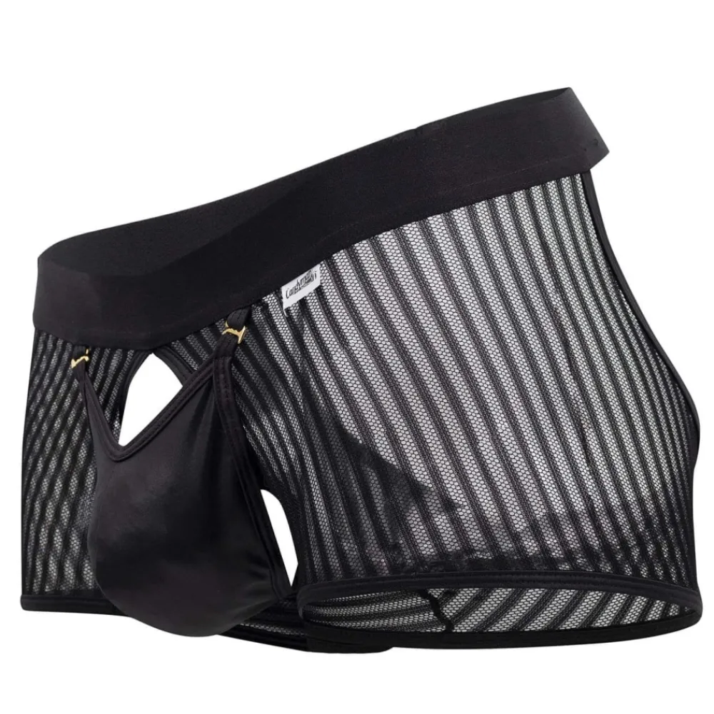Boxer sexy et provocant en résille rayée transparente. Poche frontale opaque qui s’ouvre grâce à 2 crochets métalliques. Découpe sur les fesses pour une totale liberté de mouvement.