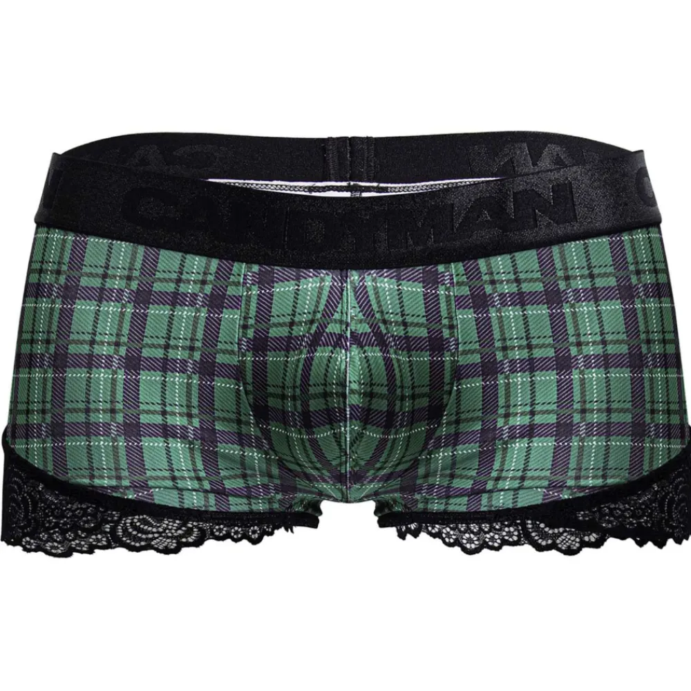 Shorty sexy en microfibre douce et extensible imprimée d’un motif tartan. Détails en dentelle sur les cuisses. Poche frontale non doublée. Ceinture élastique large.