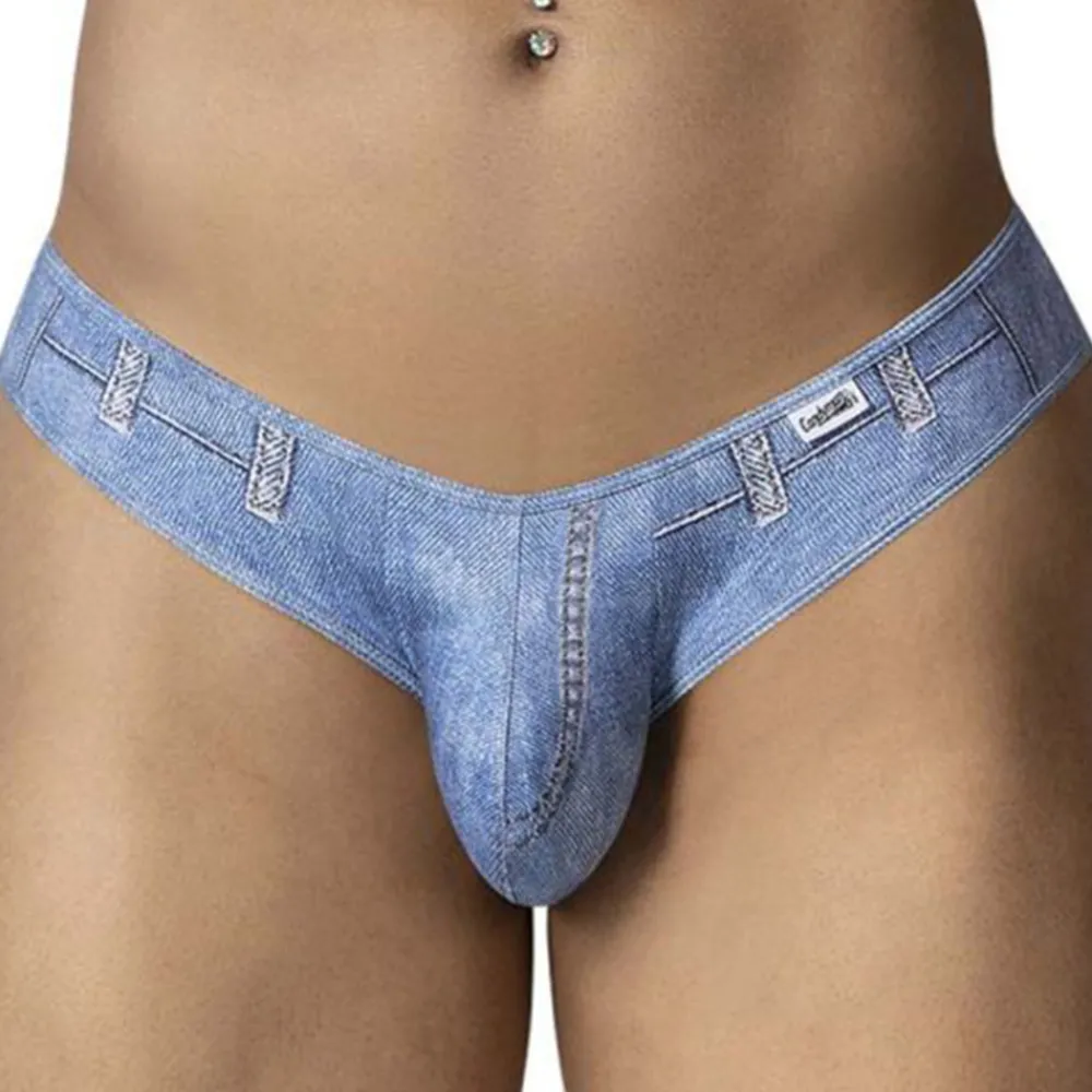 Slip très sexy en microfibre douce et extensible au look denim. Imprimé en trompe-l’œil imitant coutures, rivets, poches, braguette et passants de ceinture d’un jeans. Découpe factice sur les fesses révélant un tatouage qui attire l’oeil. Poche frontale non doublée.