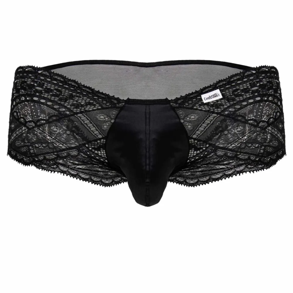 Slip ultra sexy et provocant combinant résille transparente et dentelle délicate. Coupe super taille basse. Poche frontale non doublée en microfibre imitant le cuir.