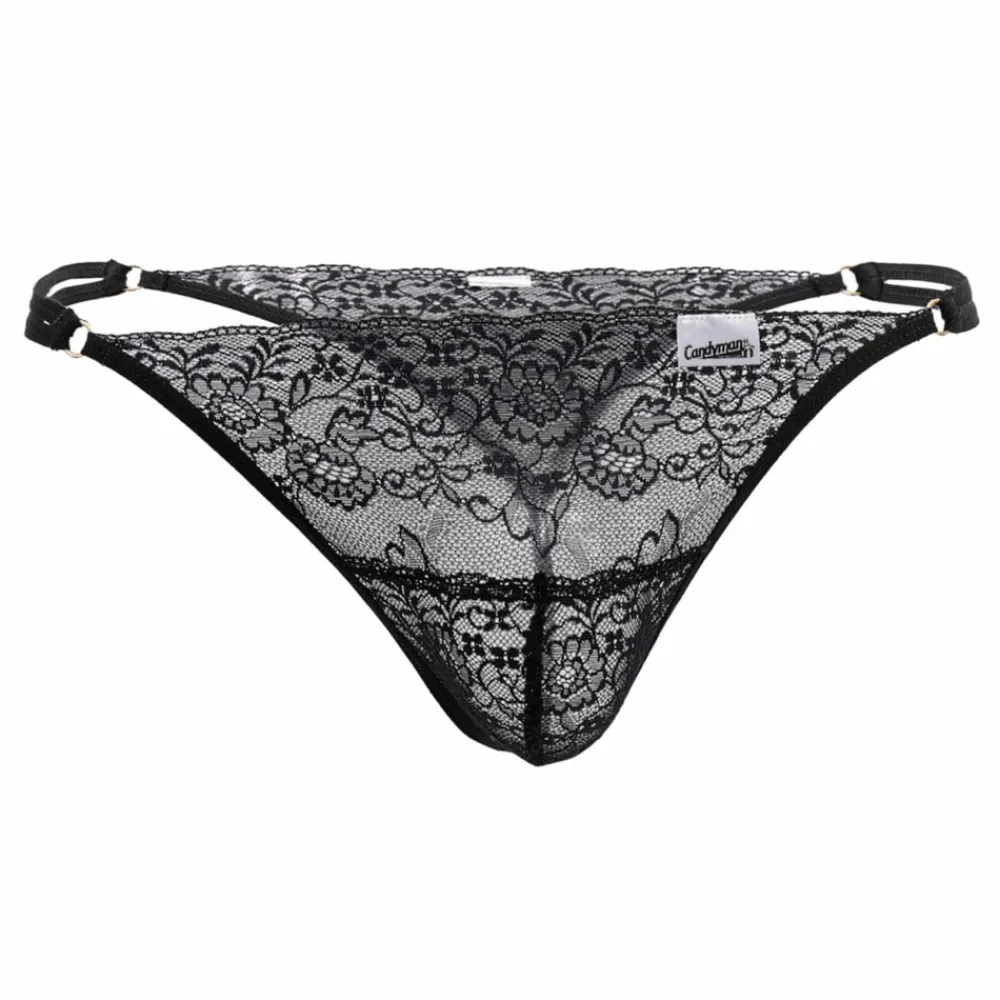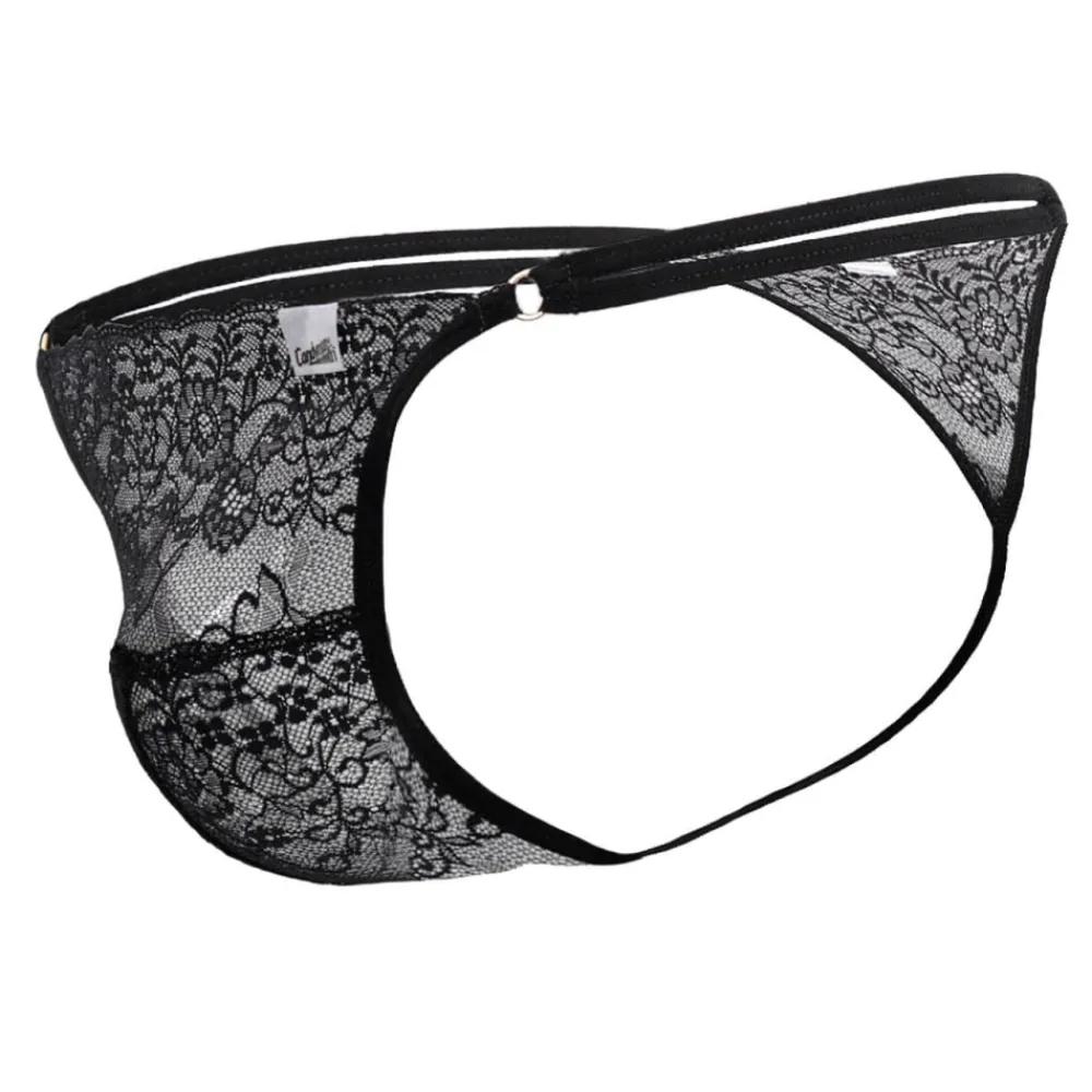 String taille basse, sexy et provocant, en dentelle transparente. Fines bandes élastiques attachées par de petits anneaux dorés sur les côtés.