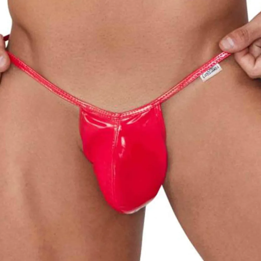 String ficelle ultra sexy et provocant en vinyle brillant. Coupe originale avec deux anneaux métalliques à l’arrière. Poche frontale préformée, non doublée.