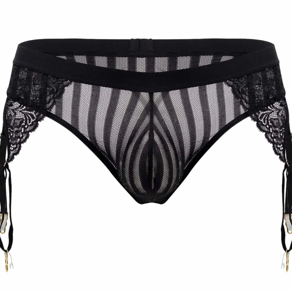 String très sexy et provocant avec son alternance de rayures opaques et transparentes. Porte-jarretelle intégré en dentelle florale, avec bandes élastiques réglables et clips pour attacher des bas (vendus séparément).