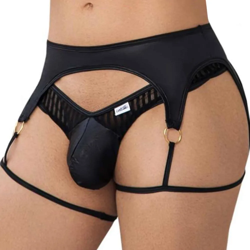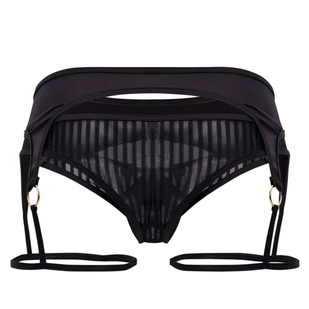 String très sexy en voile rayé semi-transparent. Jarretière en microfibre stretch avec fines bretelles et anneaux en métal. Poche frontale opaque, préformée et non doublée.