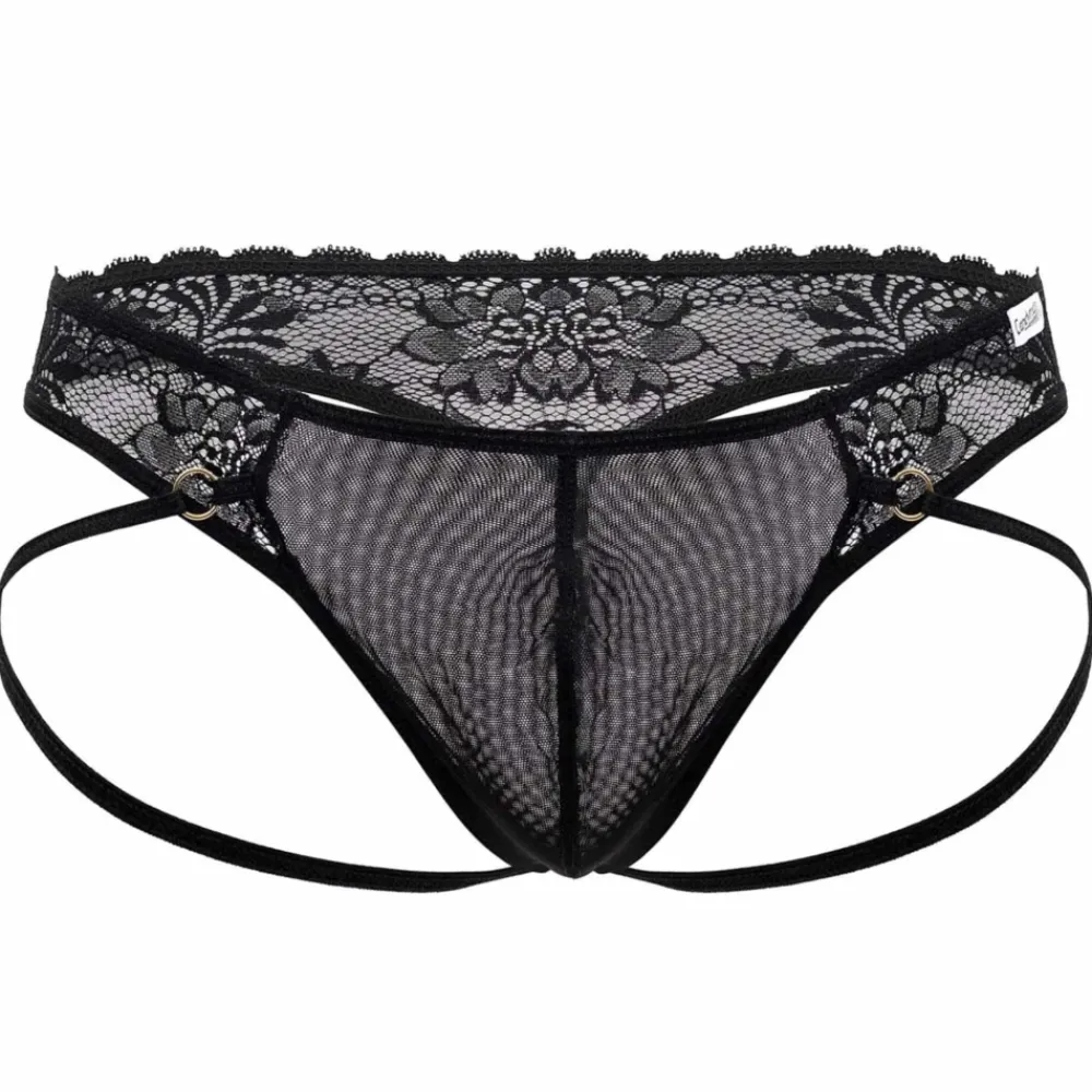 String taille basse sexy et provocant en dentelle transparente ornée d’un motif floral très sensuel. Design original doté de 2 straps élastiques façon jock sur les côtés, reliés par des anneaux métalliques dorés. Poche frontale en résille non doublée.