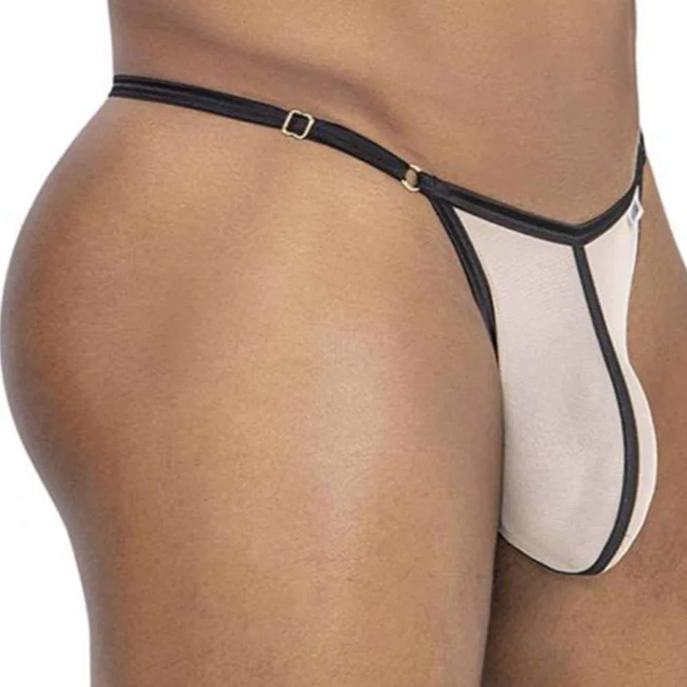 String très sexy en résille douce et totalement transparente. Détails de couleur contrastée. Poche frontale non doublée. Fine ceinture élastique ajustable ornée d’anneaux métalliques dorés.