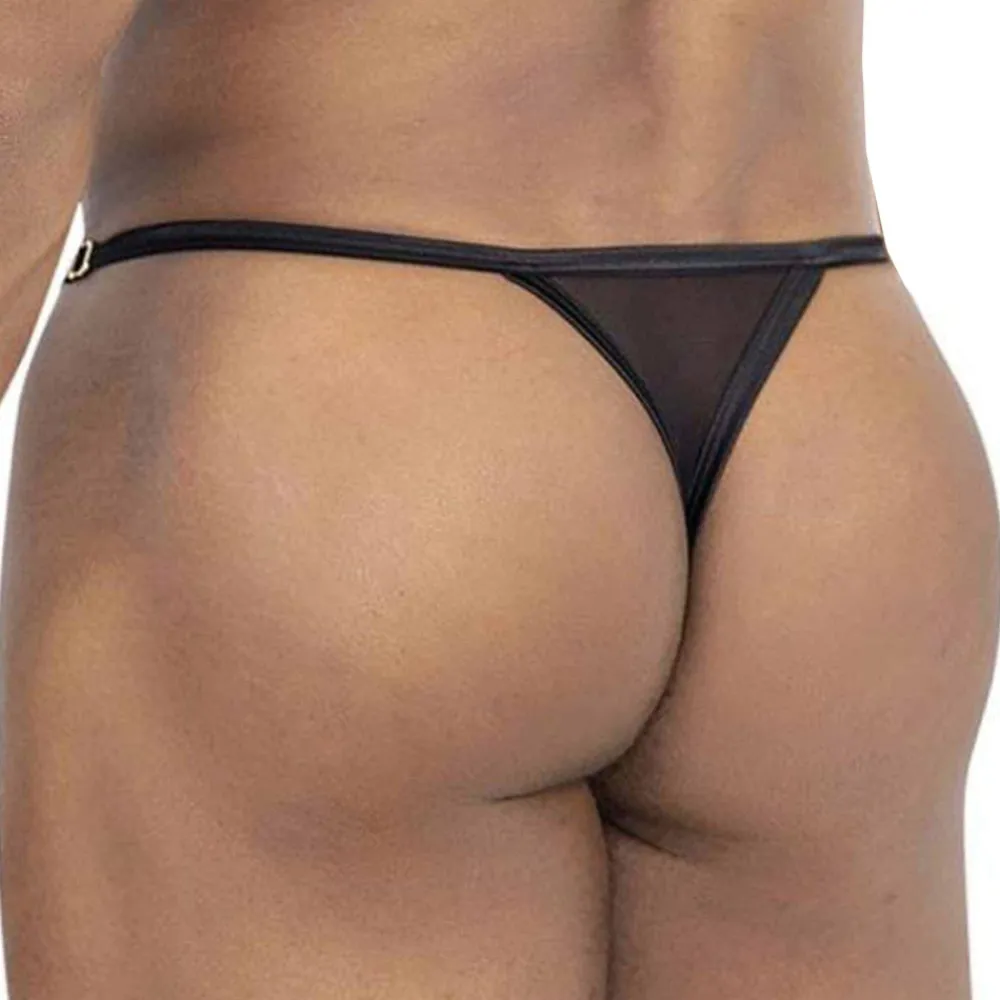 String très sexy en résille douce et totalement transparente. Poche frontale non doublée. Fine ceinture élastique ajustable ornée d’anneaux métalliques dorés.