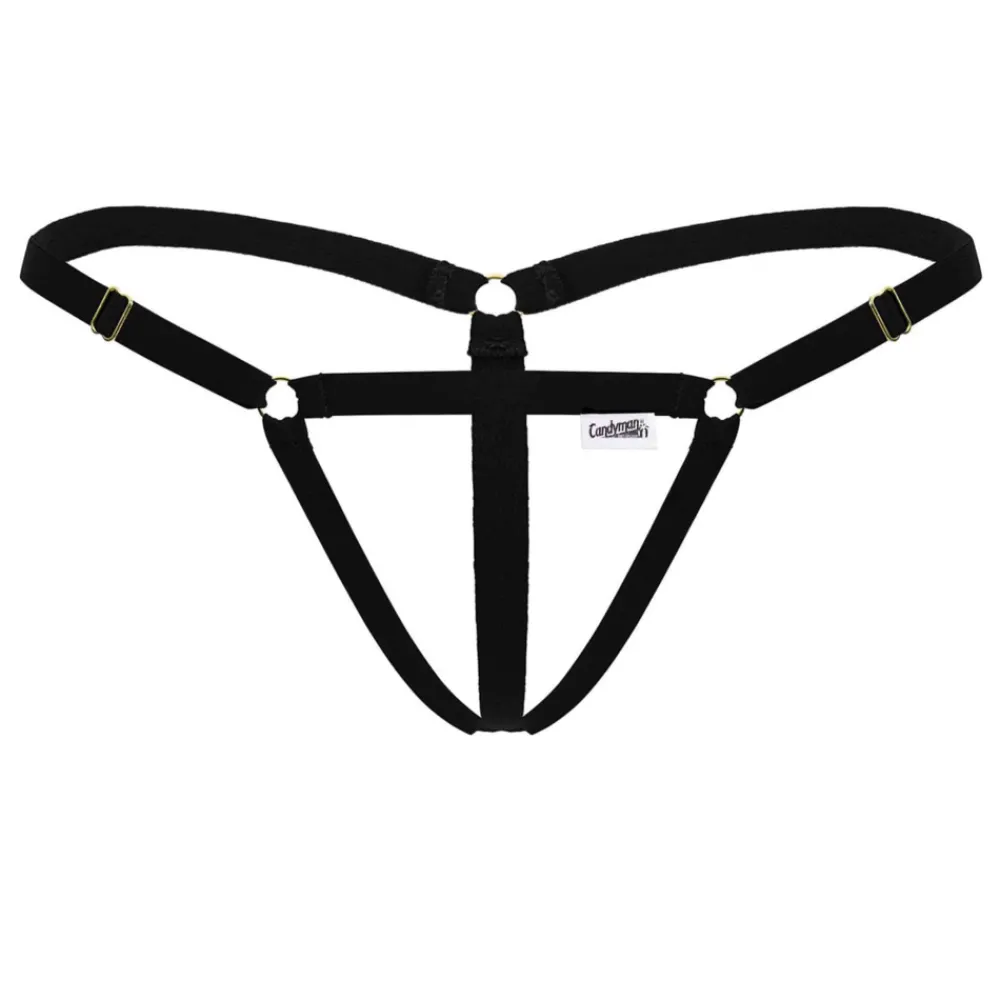 String ficelle minimaliste composé de bandes élastiques fines et ajustables reliées par de petits anneaux métalliques. Complètement ouvert devant pour ne rien cacher.