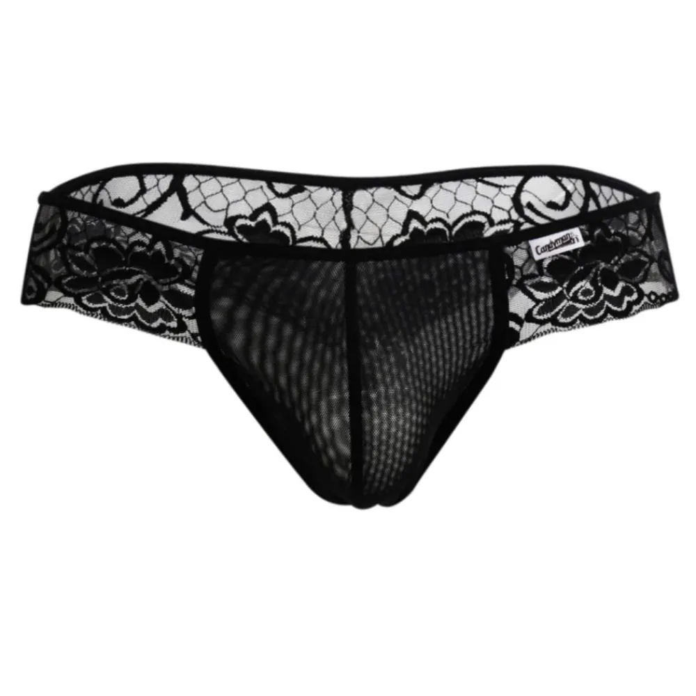 String très sexy en dentelle forale transparente. Poche frontale opaque non doublée en résille.