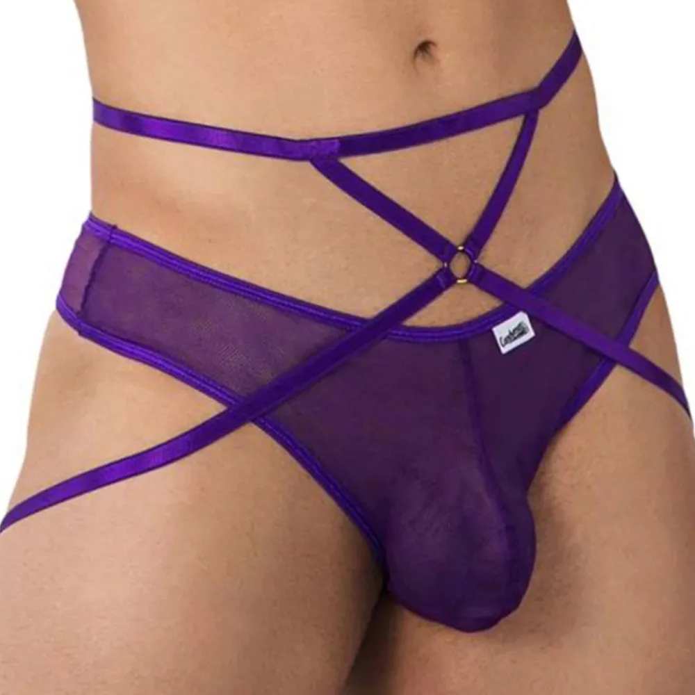 String très sexy en résille transparente. Fines bretelles autour de la taille et des fesses. Anneau métallique à l’avant et fermeture par crochet l’arrière.