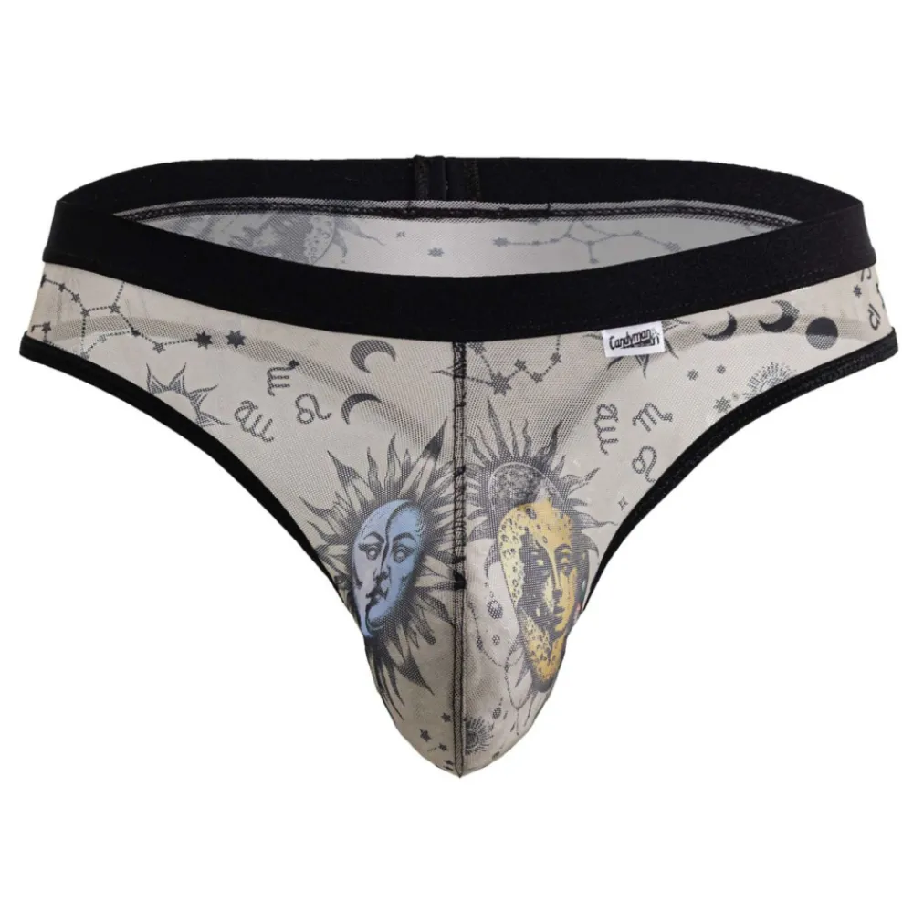 String très sexy en résille transparente imprimée d’un motif mystique constitué de soleils, lunes et signes astrologiques. Coupe minimaliste, taille basse et ajustée. Poche frontale préformée, non doublée. Ceinture élastique.