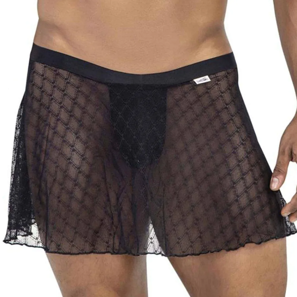 Jupe très sexy en dentelle extensible transparente, ornée d’un motif géométrique. String intérieur en mesh pour plus de maintien et de confort. Ceinture élastique.