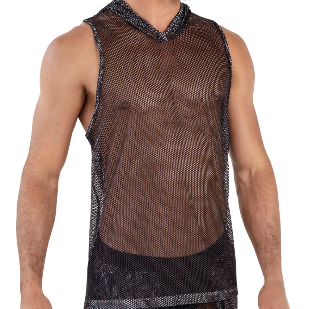 Débardeur sexy et original en résille extensible à larges mailles. Tissu transparent, léger et respirant. Dos nageur et larges ouvertures sous les bras. Col à capuche.