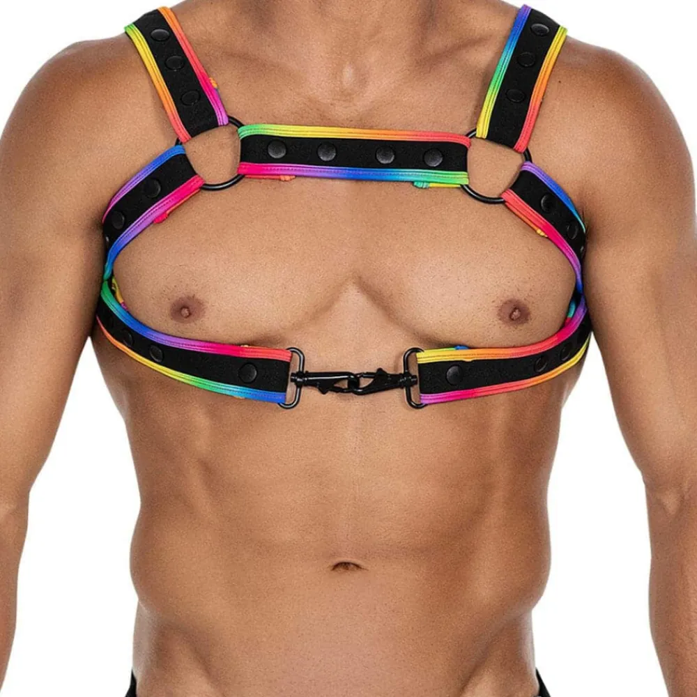 Harnais sexy et original constitué de sangles en néoprène réglables par boutons-pression. Bordures de couleur intense. 6 anneaux métalliques. 2 bretelles amovibles permettent d’attacher le harnais à un sous-vêtement grâce à 2 mousquetons. Taille unique.