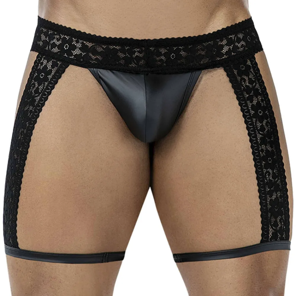 String très sexy en microfibre imitant le cuir. Jarrière intégrée en dentelle florale. Poche frontale non doublée.